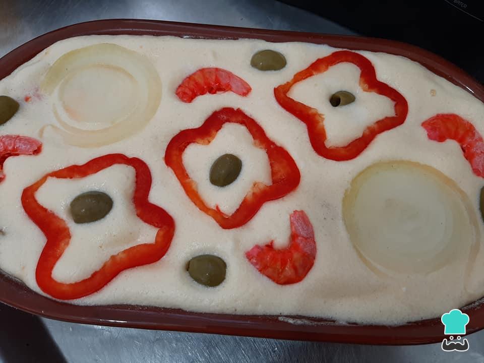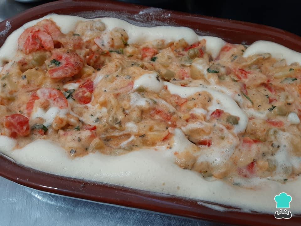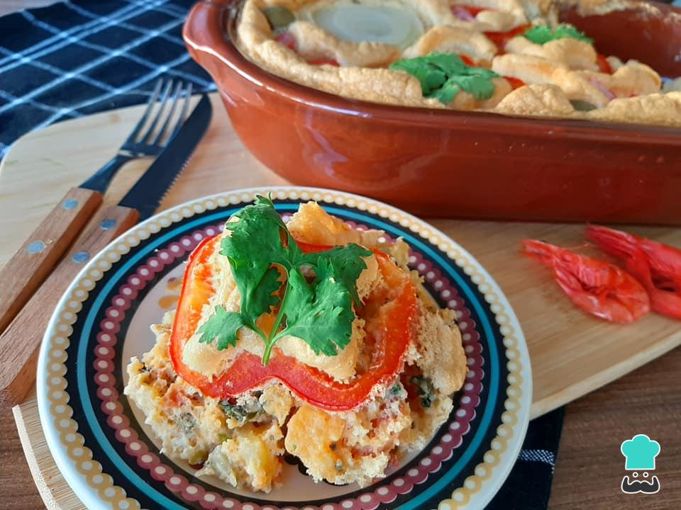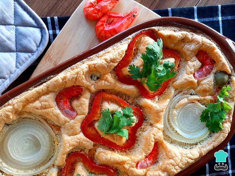 Cubra o recheio com a restante mistura de ovos em neve e decore como preferir. Aqui decoramos com rodelas de pimentão vermelho, azeitonas, cebolas e camarões secos.