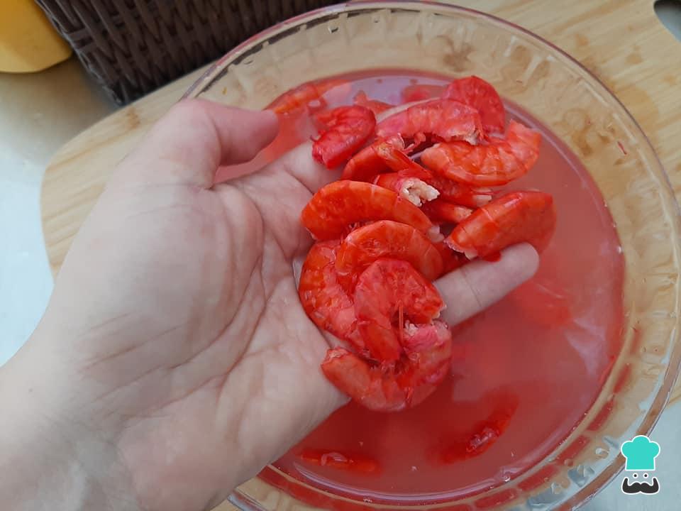 Antes de iniciar a receita, é preciso deixar o camarão seco de molho na água (trocando-a umas 4 vezes) por 12 horas ou, se preferir, de um dia para o outro, para retirar o excesso de sal e de corante (se for o caso de ter corante nos camarões). Depois desse processo, retire as cabeças e rabos dos camarões.