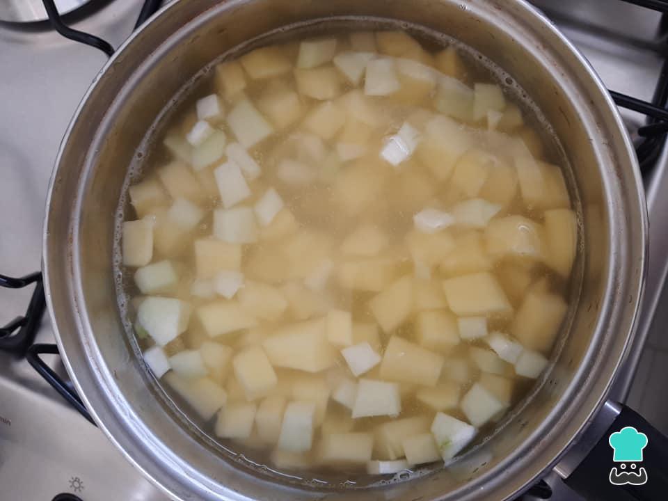 Enquanto isso, cozinhe as batatas e o chuchu em água e sal ou, se preferir, cozinhe-os a vapor, sem deixar que cozinhem demais.