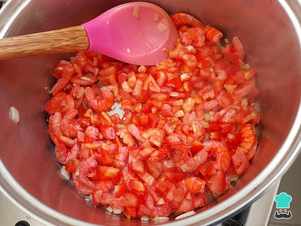 Numa panela grande, aqueça o azeite de oliva e refogue a cebola e o alho picados até dourarem levemente. Em seguida adicione os camarões secos, os tomates e o pimentão, refogando-os por 5 minutos em fogo médio, mexendo de vez em quando.