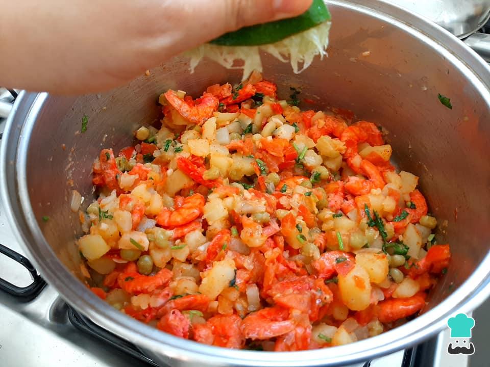Adicione o limão e misture bem. Desligue o fogo e deixe o recheio ficar morno para dar continuidade ao preparo desta torta salgada maranhense.