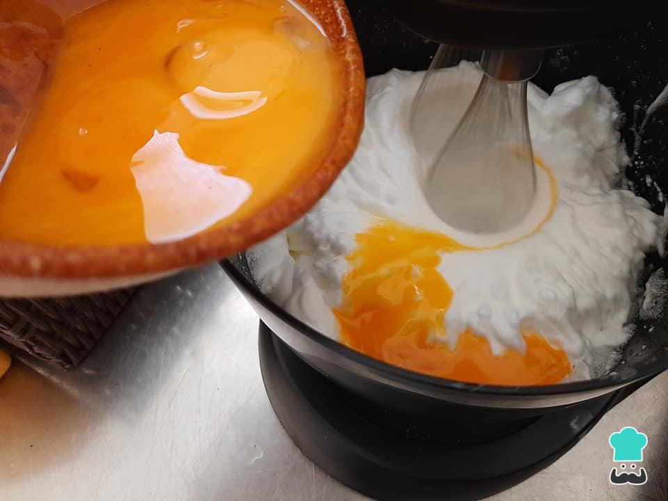 Na batedeira, bata as claras em neve com uma pitada de sal. Depois acrescente as gemas (uma a uma) e continue batendo.