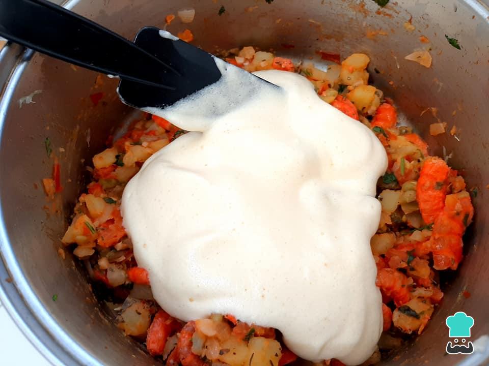 Adicione 2 conchas dos ovos batidos em neve ao refogado já morno, misturando delicadamente, para não perder o ar. Reserve.