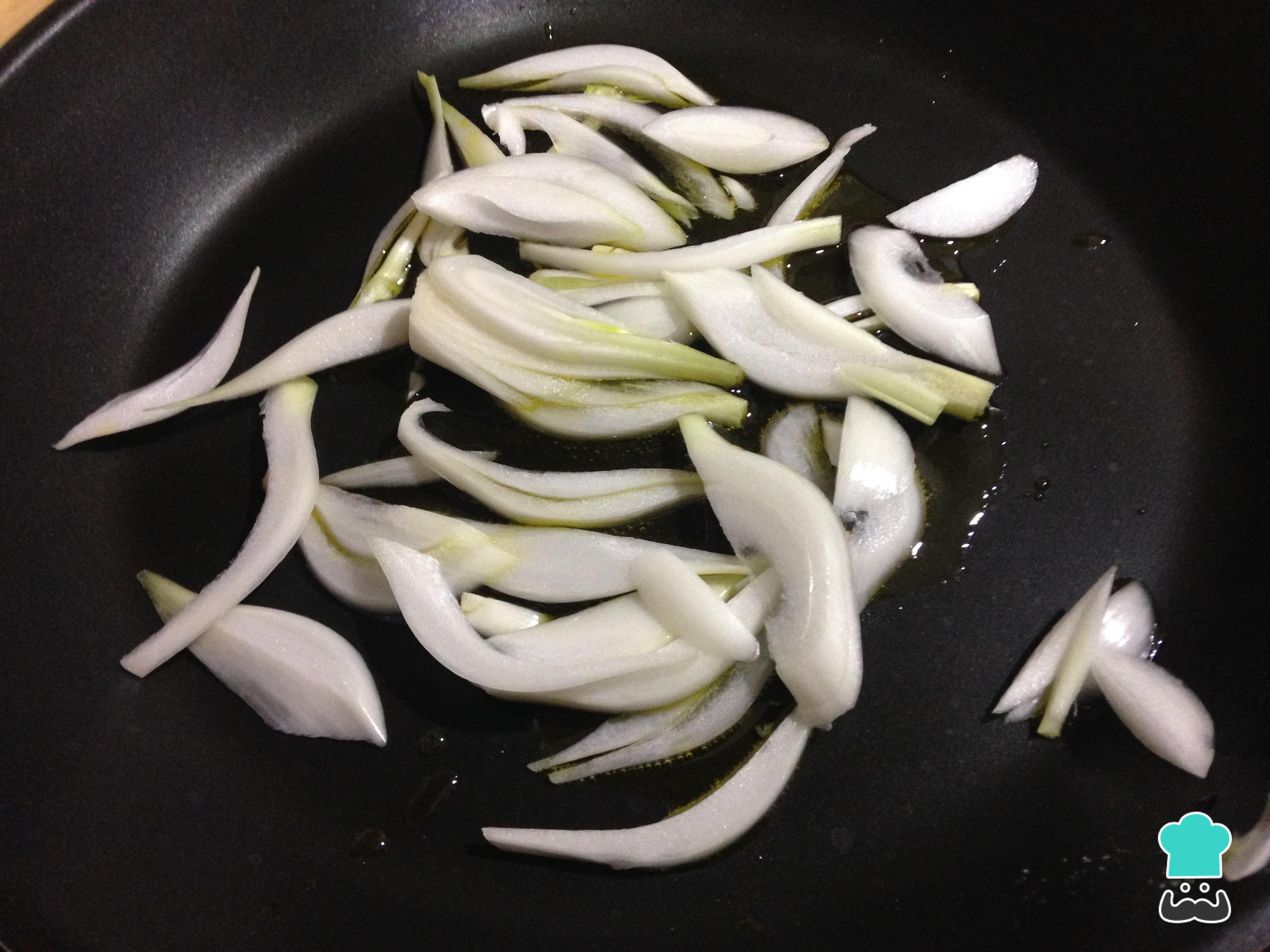 Com a massa pronta, é hora de preparar o recheio desta empanada: leve ao fogo médio uma frigideira com a cebola cortada em pedaços e o azeite, e deixe refogar.