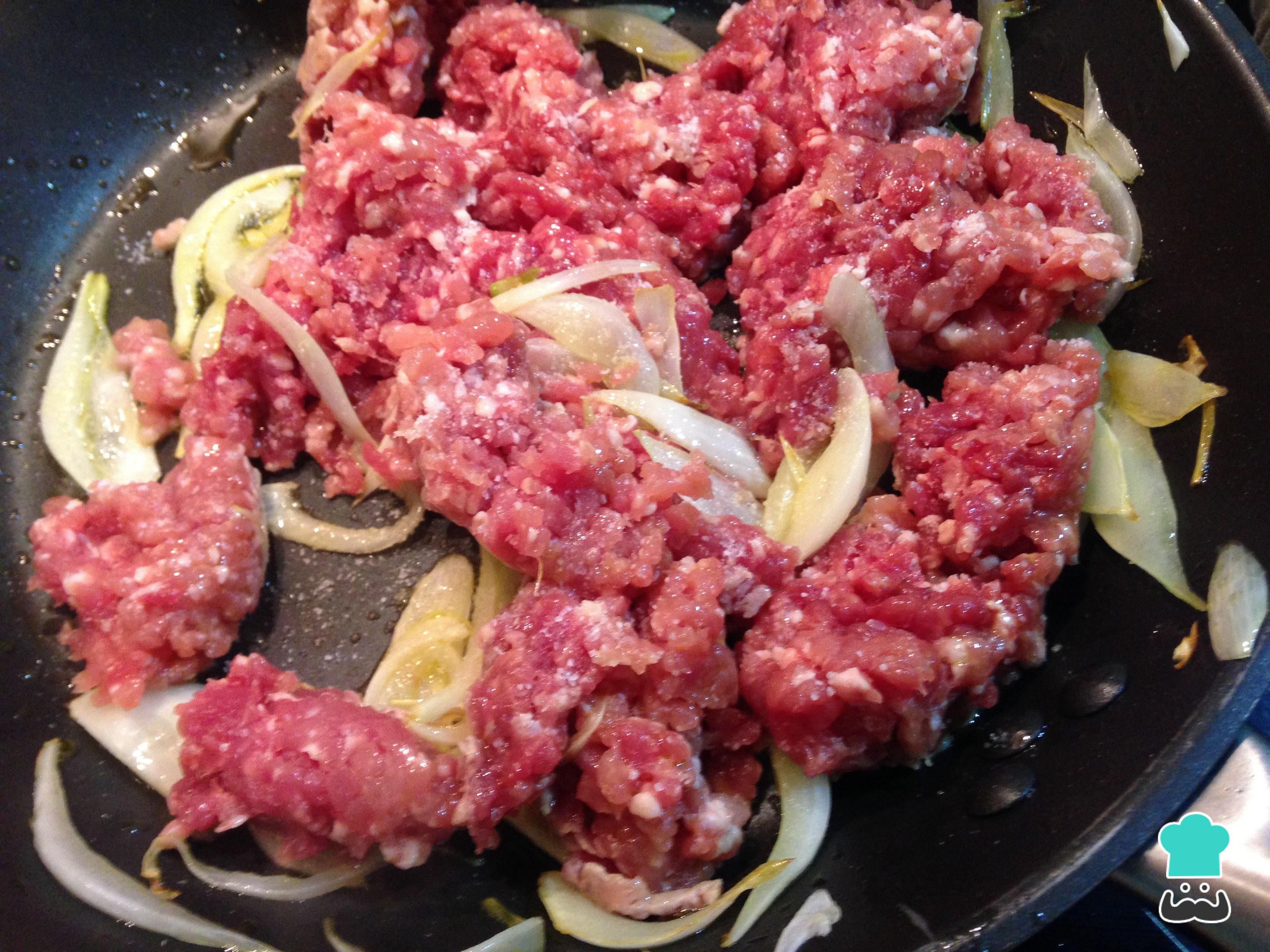 Quando a cebola estiver transparente, adicione a carne moída e tempere com sal e pimenta. Fique mexendo a carne para soltar e, quando estiver dourada, acrescente a páprica.