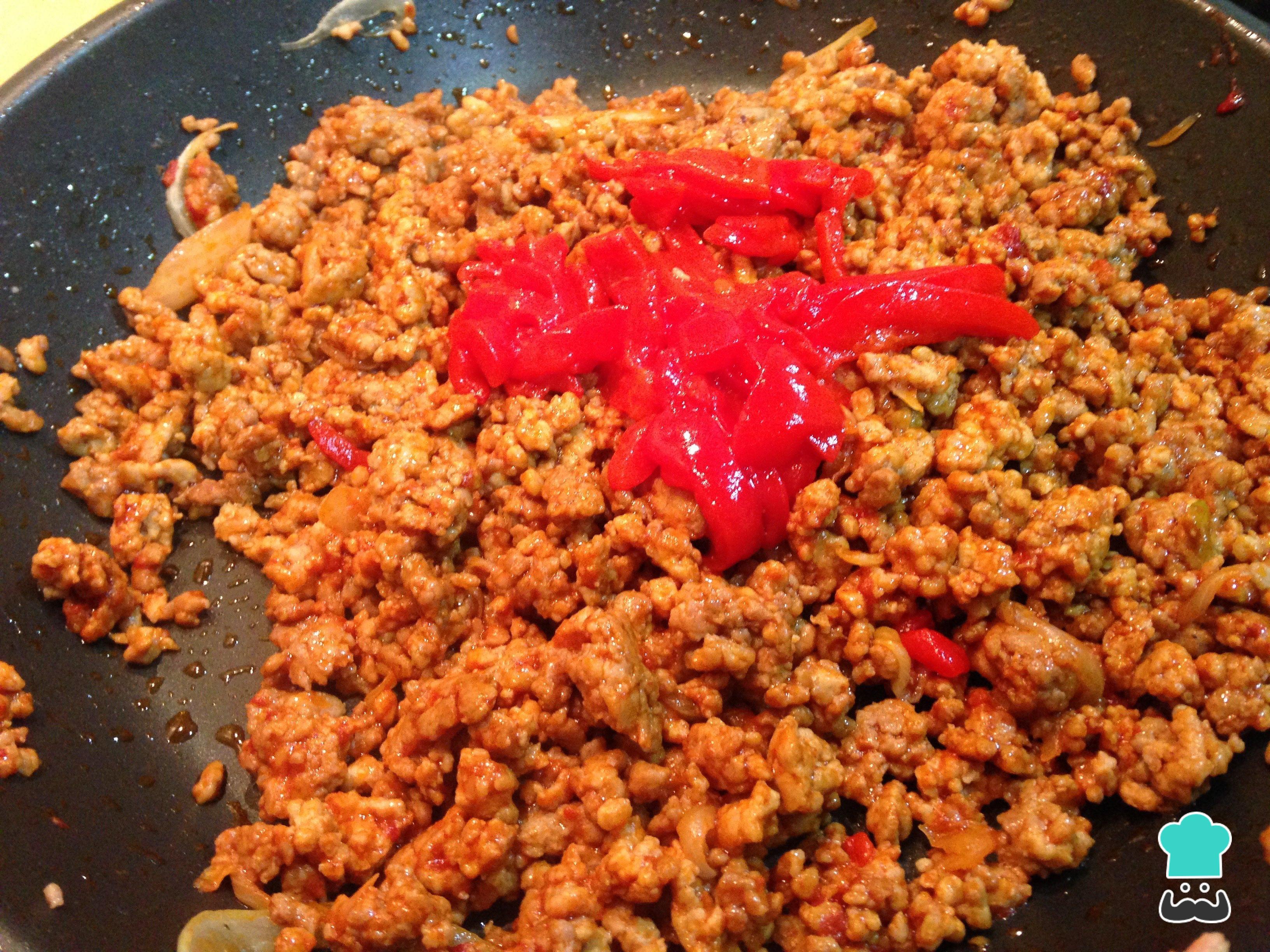 O passo seguinte é adicionar a pasta de tomate, misturar e deixar cozinhar até a carne estar pronta. Por fim, acrescente os pimentões em conserva cortados em tiras e envolva na carne.