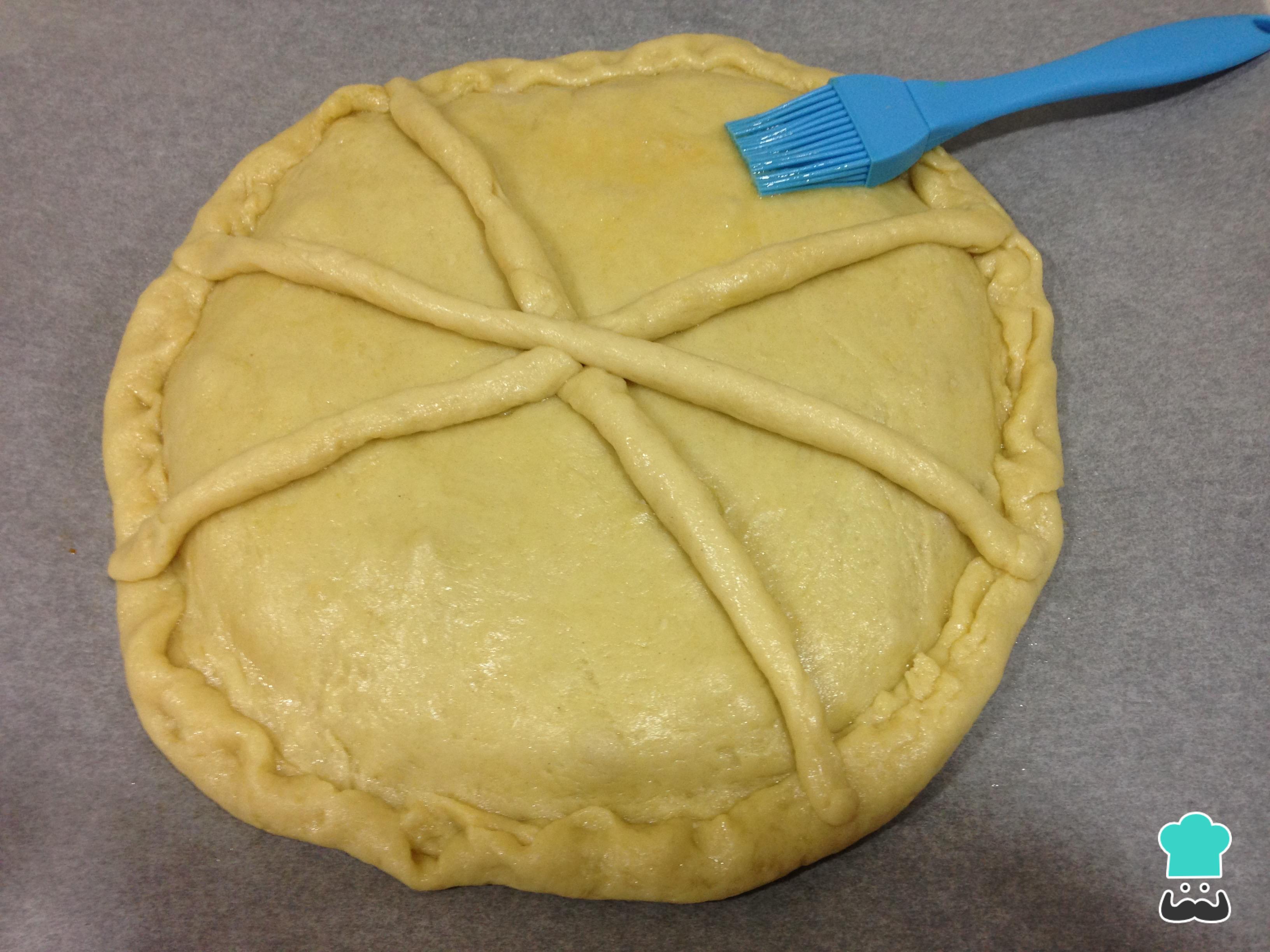 Finalmente, pincele a massa com um pouco de ovo batido, e leve a assar no forno preaquecido a 180ºC até dourar.