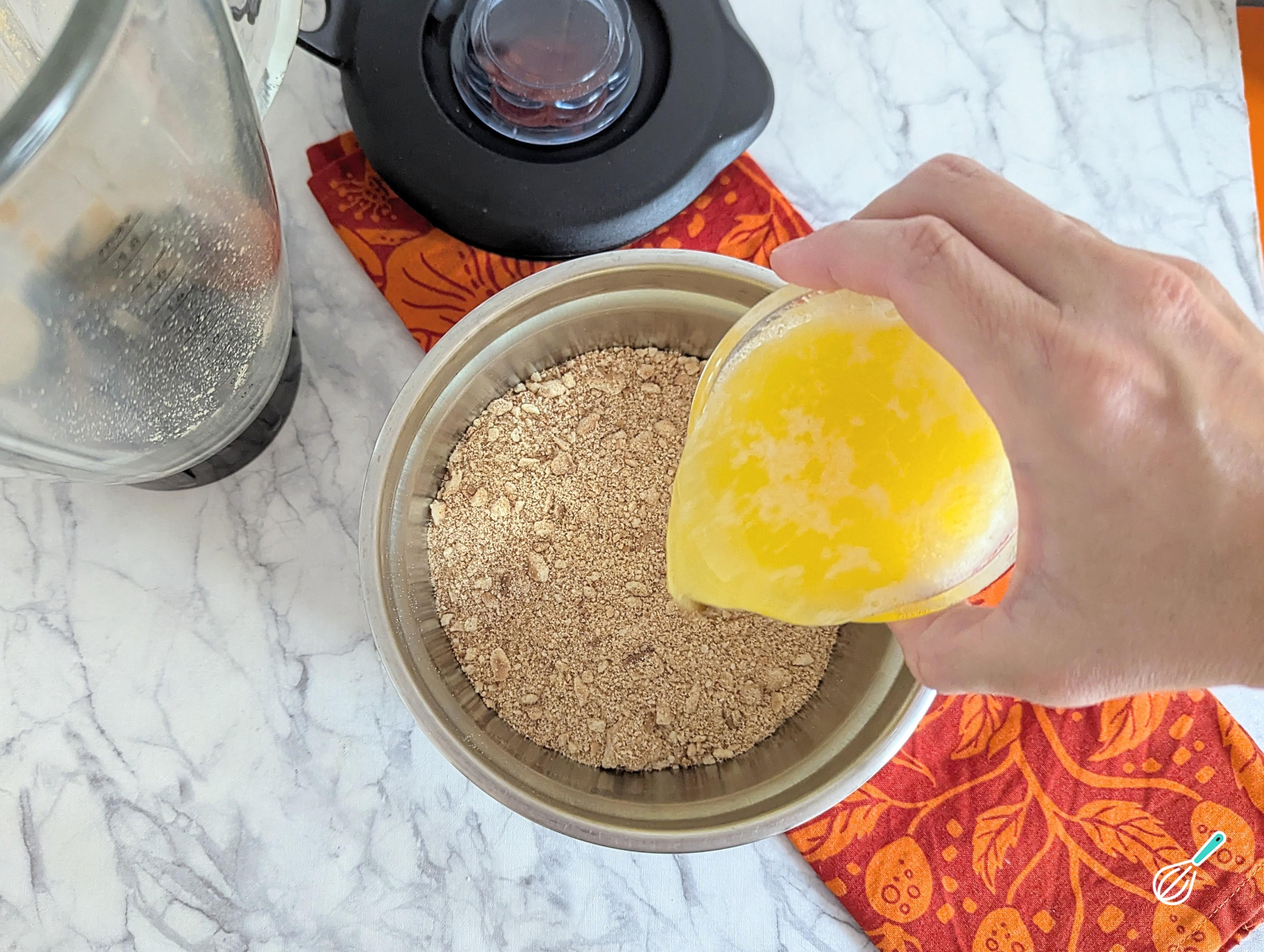 Prepare a base da torta triturando o biscoito maria no liquidificador ou processador até que vire uma farofa. Misture com a manteiga derretida até que essa farofa fique úmida.