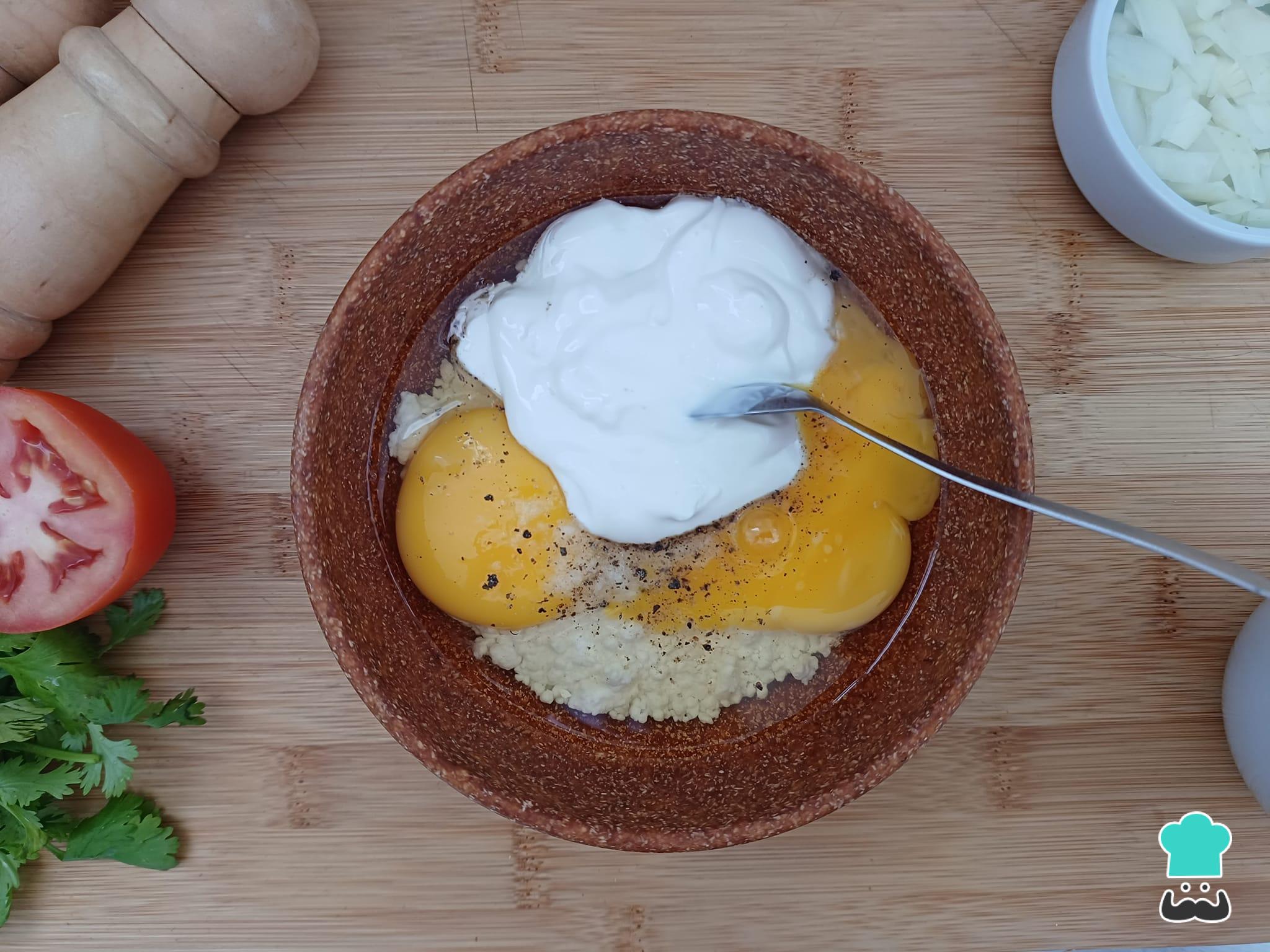 Num bowl, junte os ovos com a goma de tapioca, o requeijão cremoso, o sal e a pimenta-do-reino, misturando bem até ficar homogêneo.