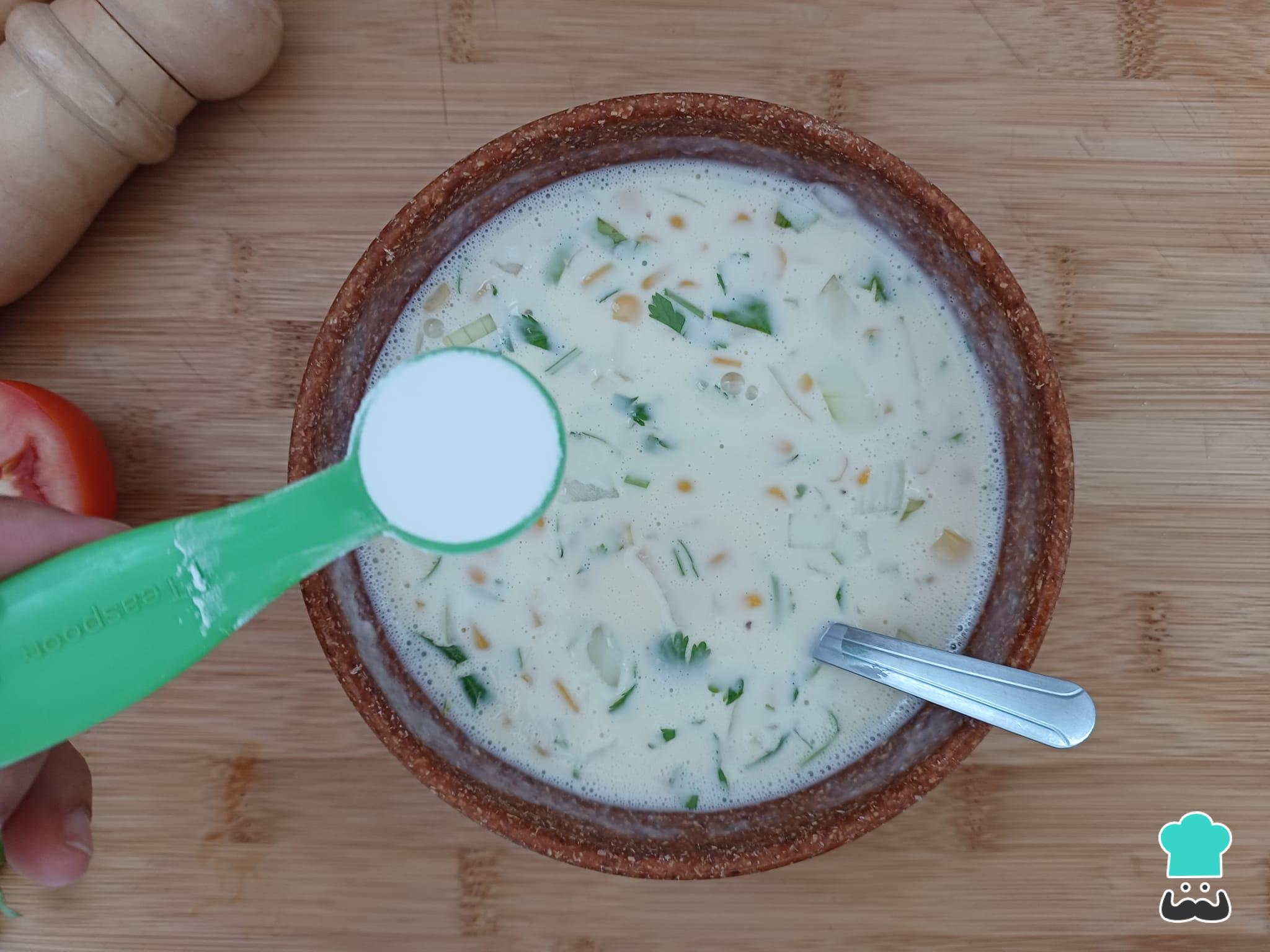 Adicione a cebola picada, o milho, o coentro picado e por último o fermento em pó, misturando novamente.