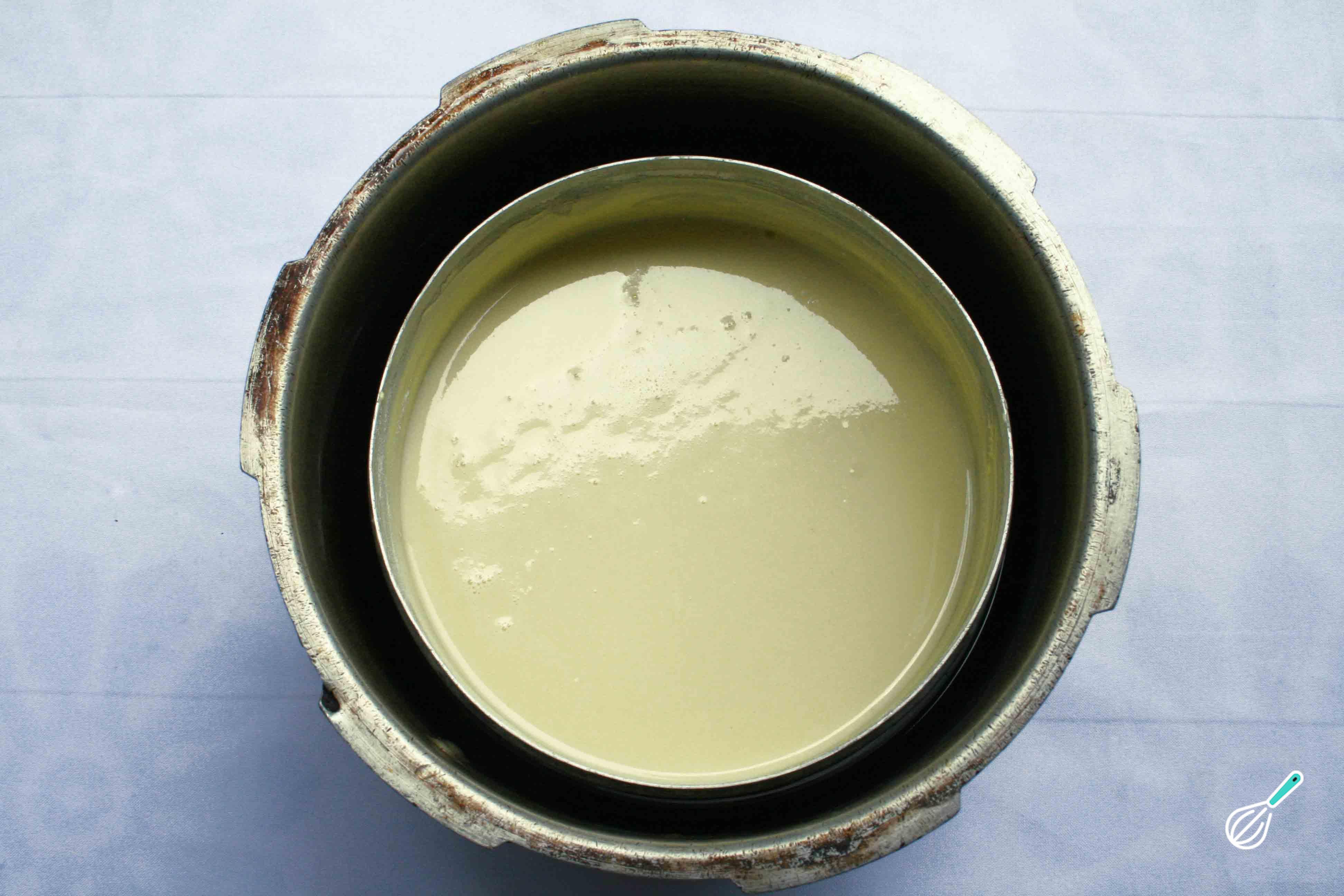 Para cozinhar a torta de coco em banho-maria coloque água quente numa assadeira ou panela grande até encher cerca de 1/3 dela. Coloque no interior da assadeira a forma com a massa da torta e cubra com papel alumínio.