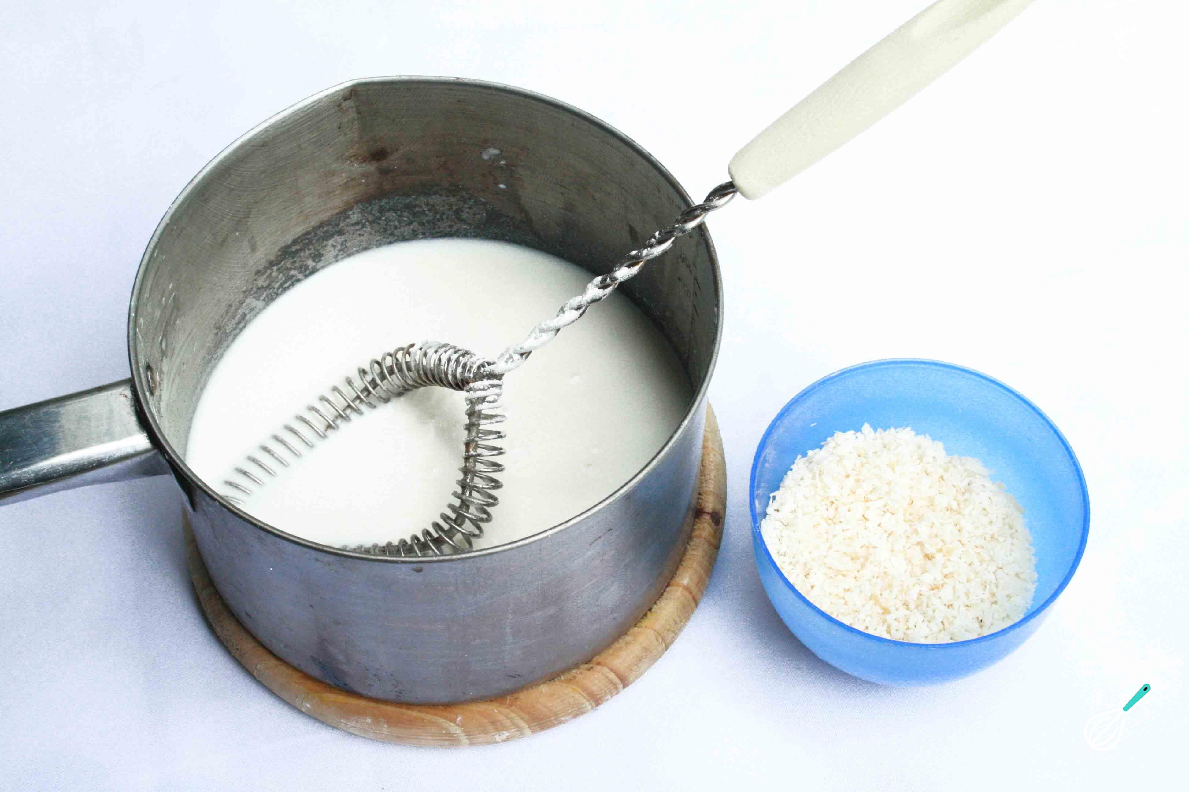 Prepare a cobertura de coco misturando numa panela o leite, a maisena e o açúcar. Acrescente as 250 gramas de coco ralado e leve ao fogo médio para alto, mexendo até começar a ferver.