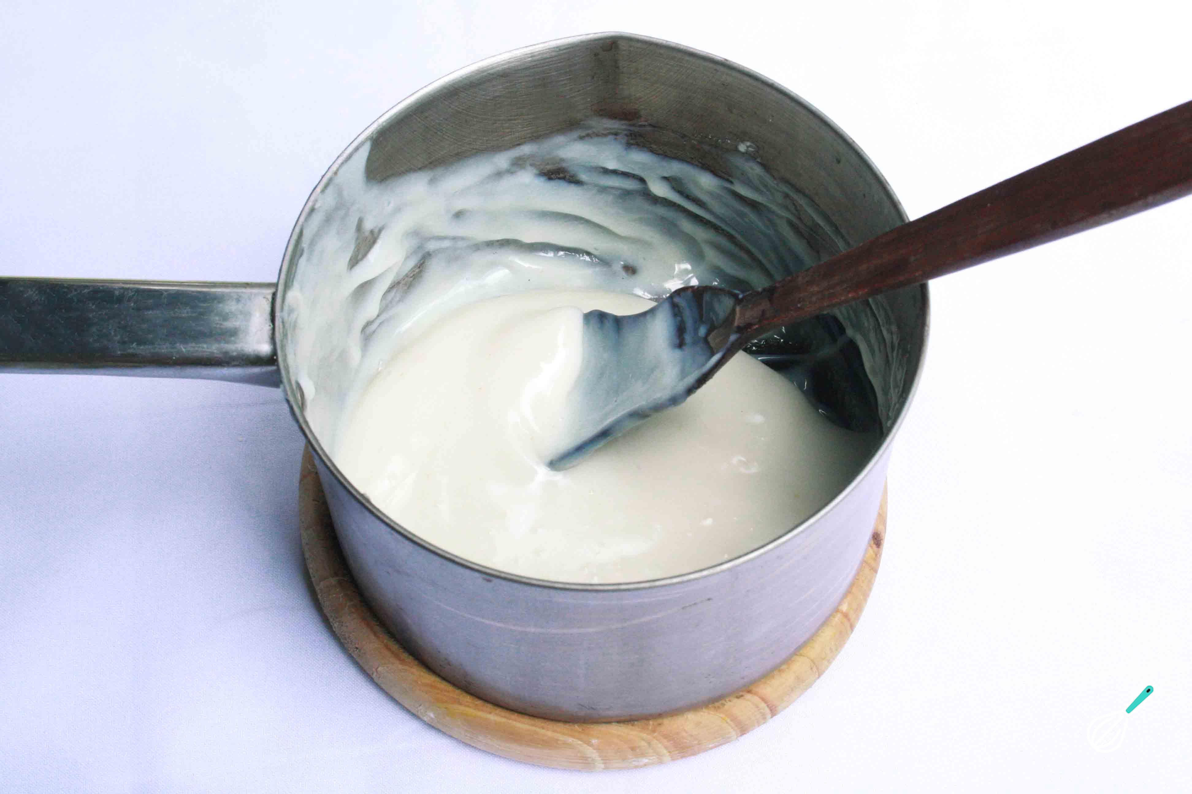 Quando ferver, fique mexendo por mais 1 minuto ou até conseguir um creme espesso. Desligue e fique mexendo mais ou pouco, para ajudar a baixar a temperatura do creme.