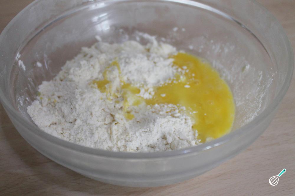 Bata ligeiramente o ovo e adicione na tigela da farofa de manteiga e farinha. Misture com as mãos até obter uma massa consistente e modelável.
