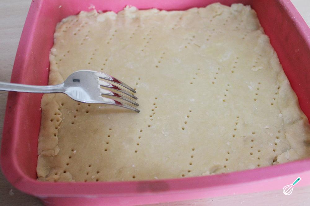 Unte com óleo ou manteiga uma forma quadrada de aproximadamente de 22 x 22 cm. Abra a massa com a ajuda de um rolo e coloque-a na forma. Pique toda a superfície com um garfo e leve para assar no forno a 180ºC durante 15 minutos ou até dourar levemente. Retire do forno e deixe esfriar um pouco.