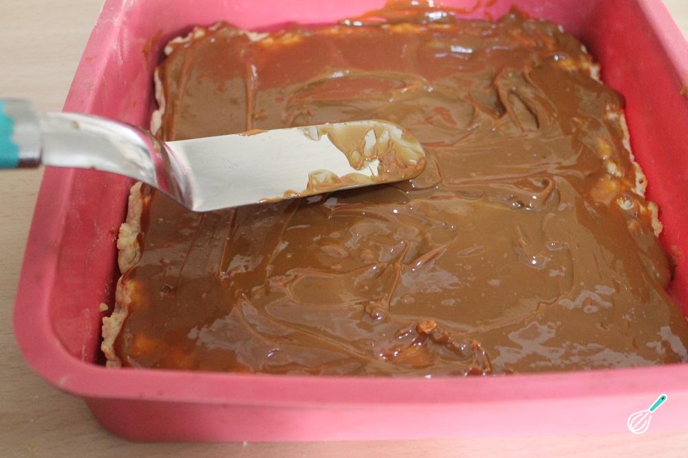 Com a ajuda de uma espátula, espalhe o doce de leite em toda a superfície da massa da torta. Reserve.