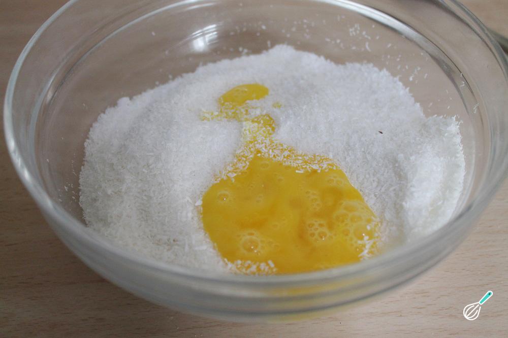 Resta preparar a cocada para a cobertura: numa tigela misture o açúcar com o coco ralado o ovo batido. Mexa muito bem até incorporar e obter uma cocada consistente e úmida.
