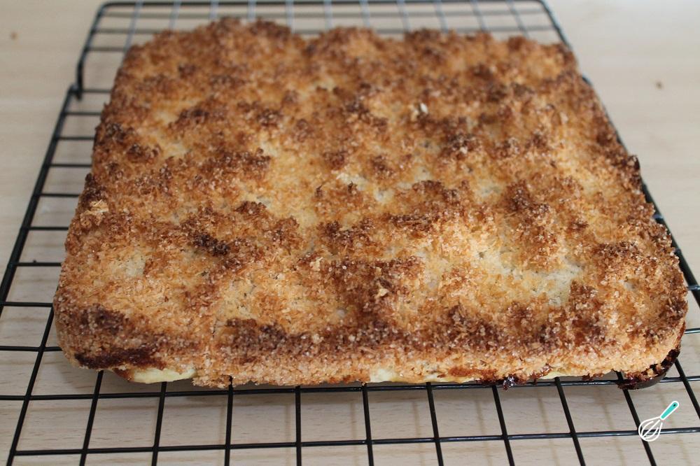 Retire a torta de doce de leite com coco do forno, desenforme e deixe que esfrie completamente em uma grade de resfriamento, como na foto.