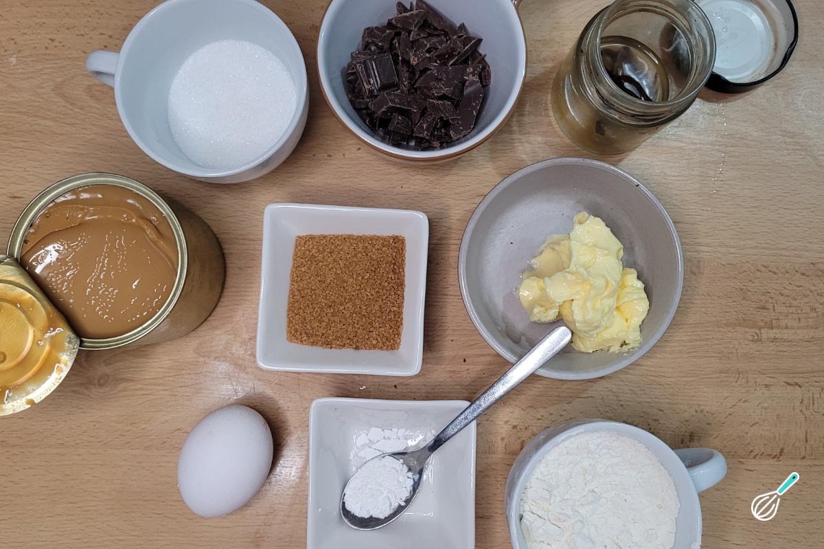 Separe os ingredientes para fazer sua torta de cookie. Aqui fiz uma mini torta em uma forma pequena, mas você pode facilmente ajustar as quantidades para uma forma maior.