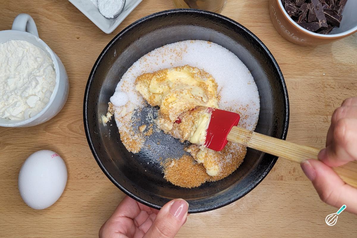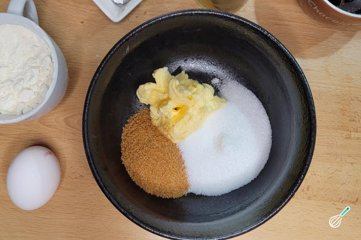 Em uma tigela, coloque a manteiga, o açúcar mascavo e o refinado.