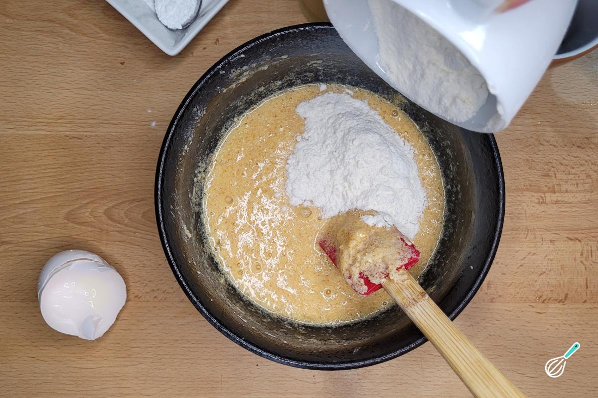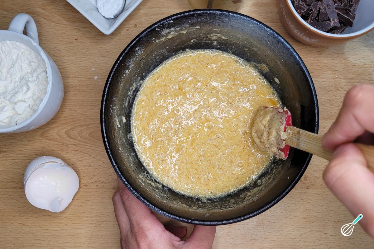 Bata bem. Pode usar uma espátula de silicone ou batedor de arame. O batedor de arame pode facilitar na aeração da mistura, mas prefiro usar a espátula porque facilita na hora de misturar os outros ingredientes, já que a massa tende a grudar entre os arames do batedor.