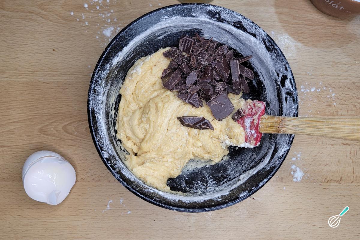 Junte o chocolate picado (ou gotas de chocolate). Usei chocolate meio amargo picado, para ficar menos doce, mas pode usar o chocolate que preferir.
