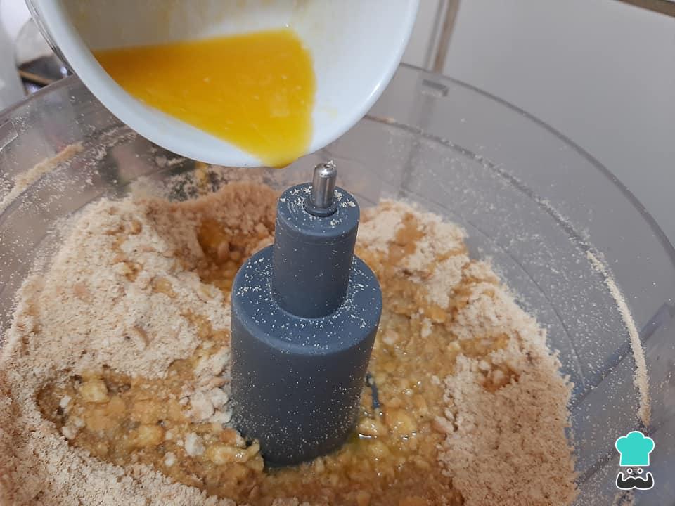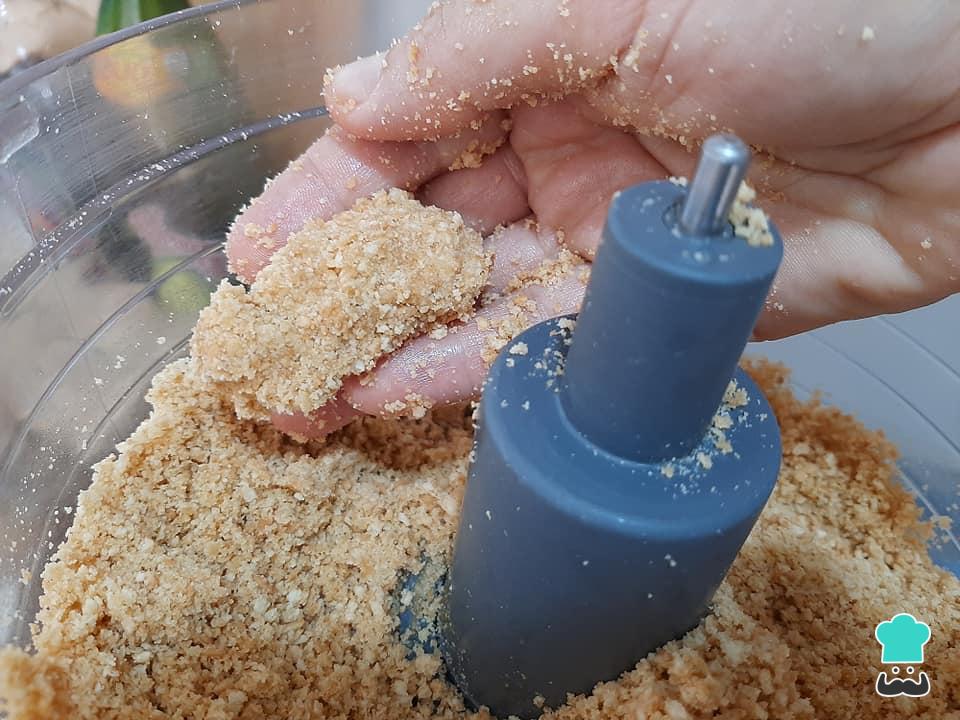 Para começar preparando a base dessa torta de doce de leite com bolacha maizena, triture a bolacha de maizena no processador.