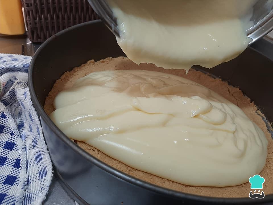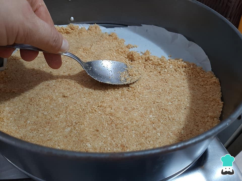 Forre o fundo de uma forma com aro removível (com cerca de 20-22 cm de diâmetro) com papel manteiga. Coloque a massa de bolacha, pressionando com a ajuda de uma colher.