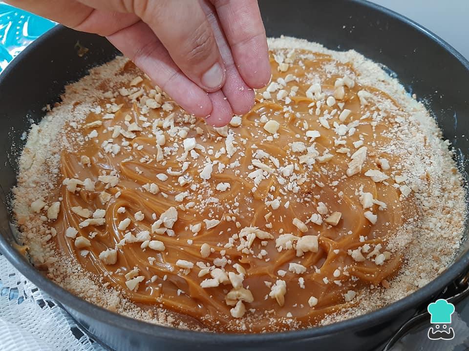 Cubra a torta com o doce de leite e decore-a com a bolacha maizena e as castanhas de caju trituradas.