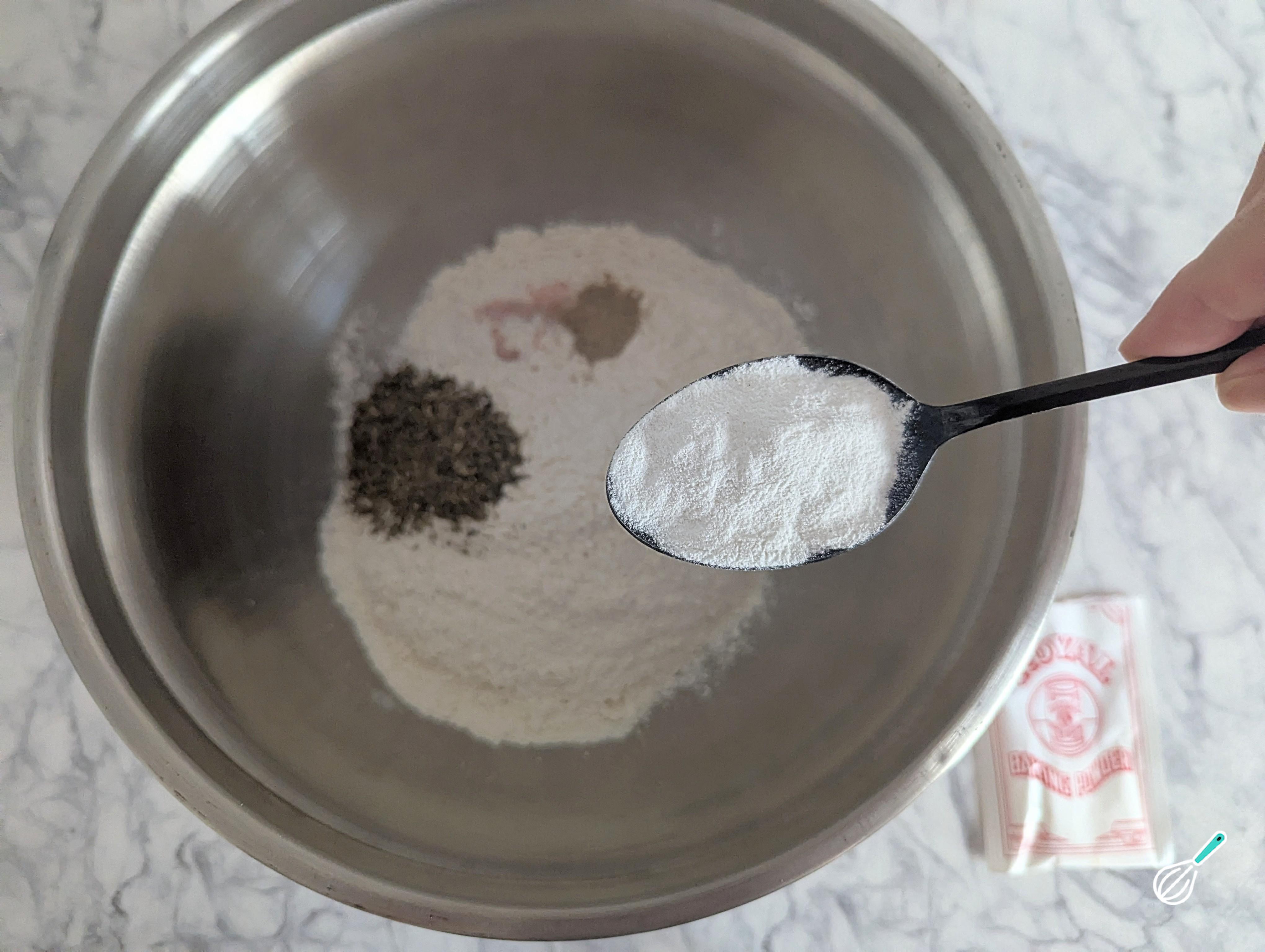 Em uma tigela grande, misture os ingredientes secos: a farinha de trigo, o fermento, o sal e pimenta. Adicione temperos de ervas da sua preferência, para dar um toque no sabor. Reserve.