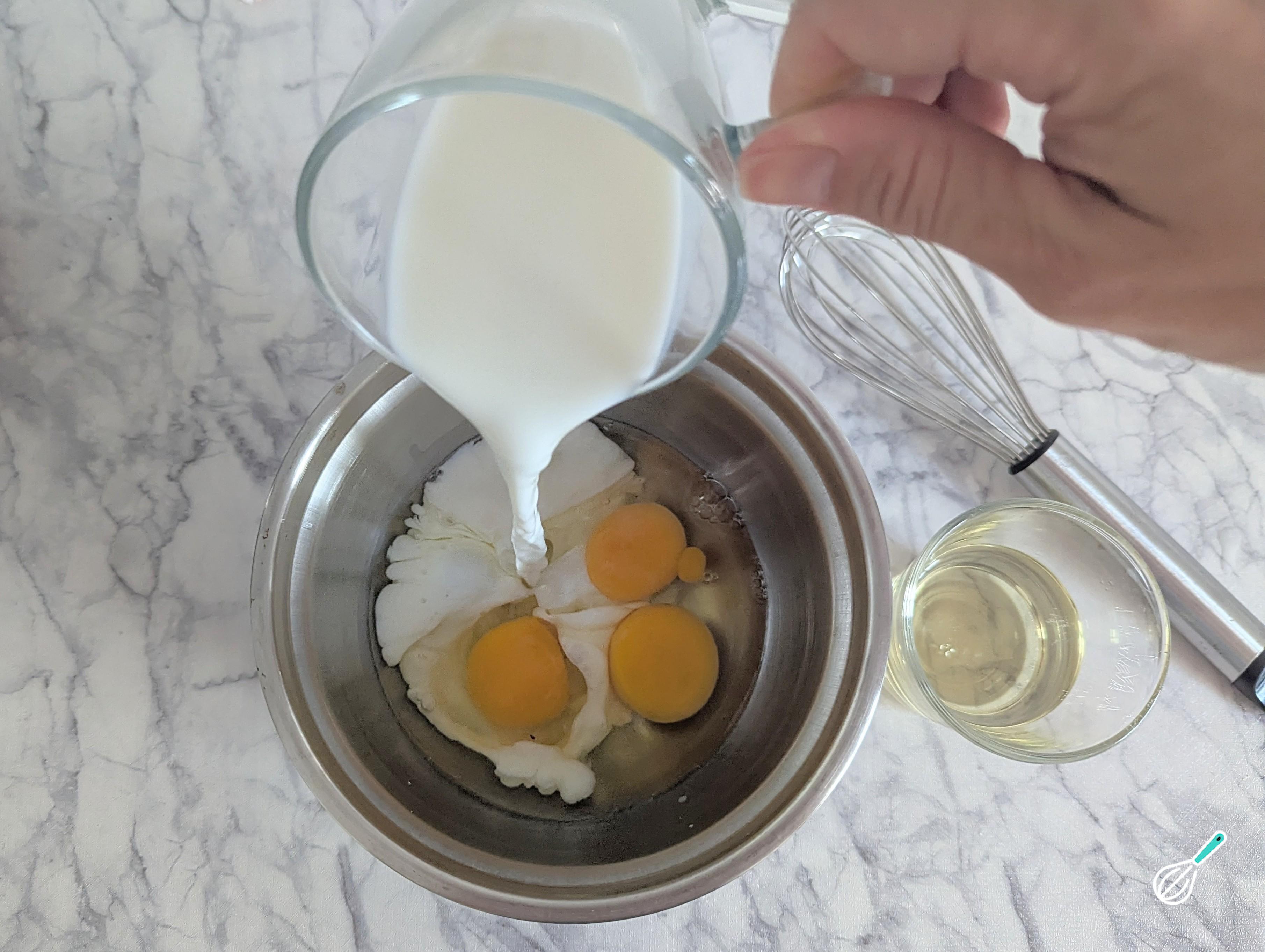 Em outro recipiente, bata os ovos ligeiramente usando um fouet ou garfo. Adicione o leite e os ovos e misture bem.