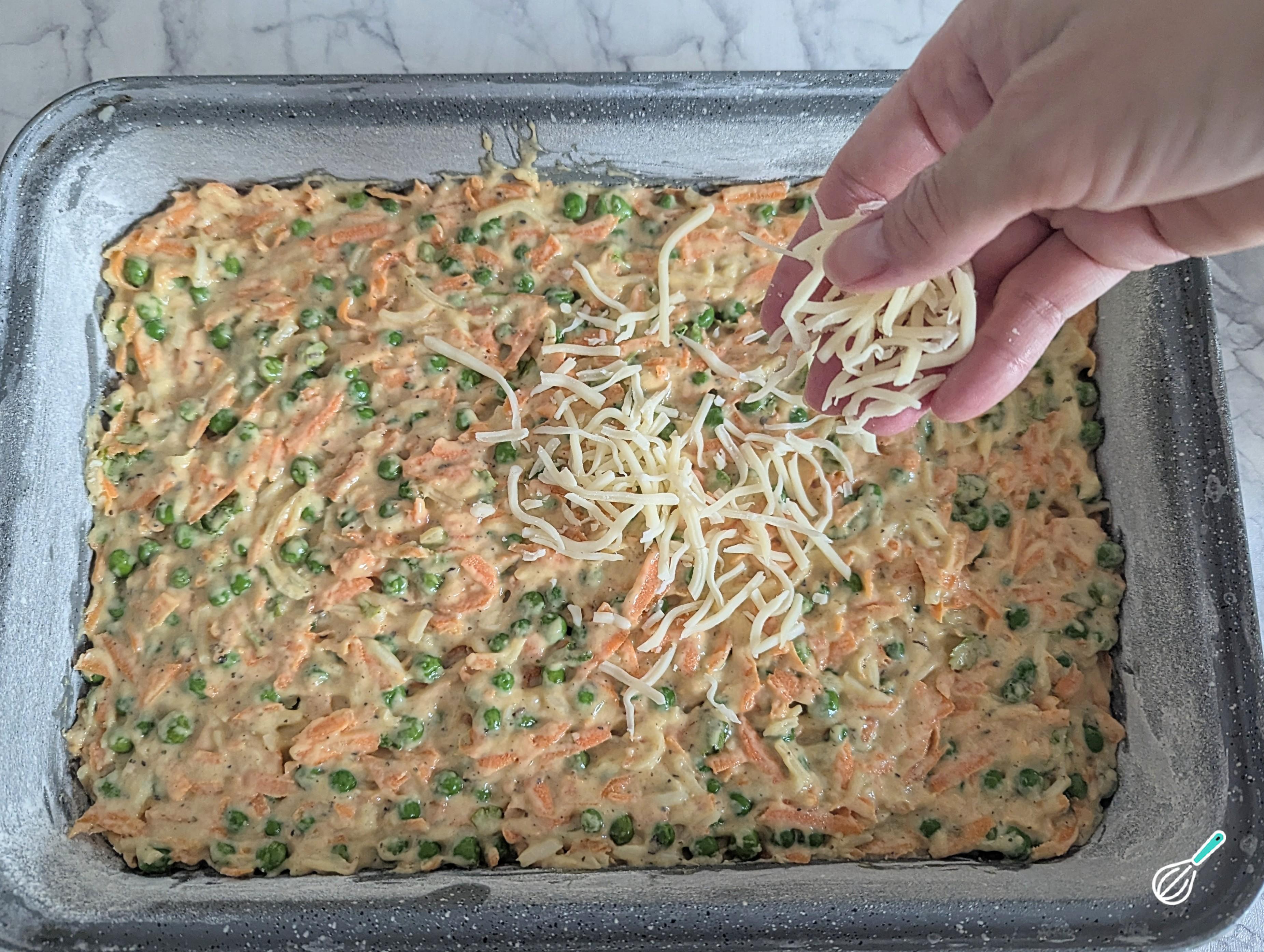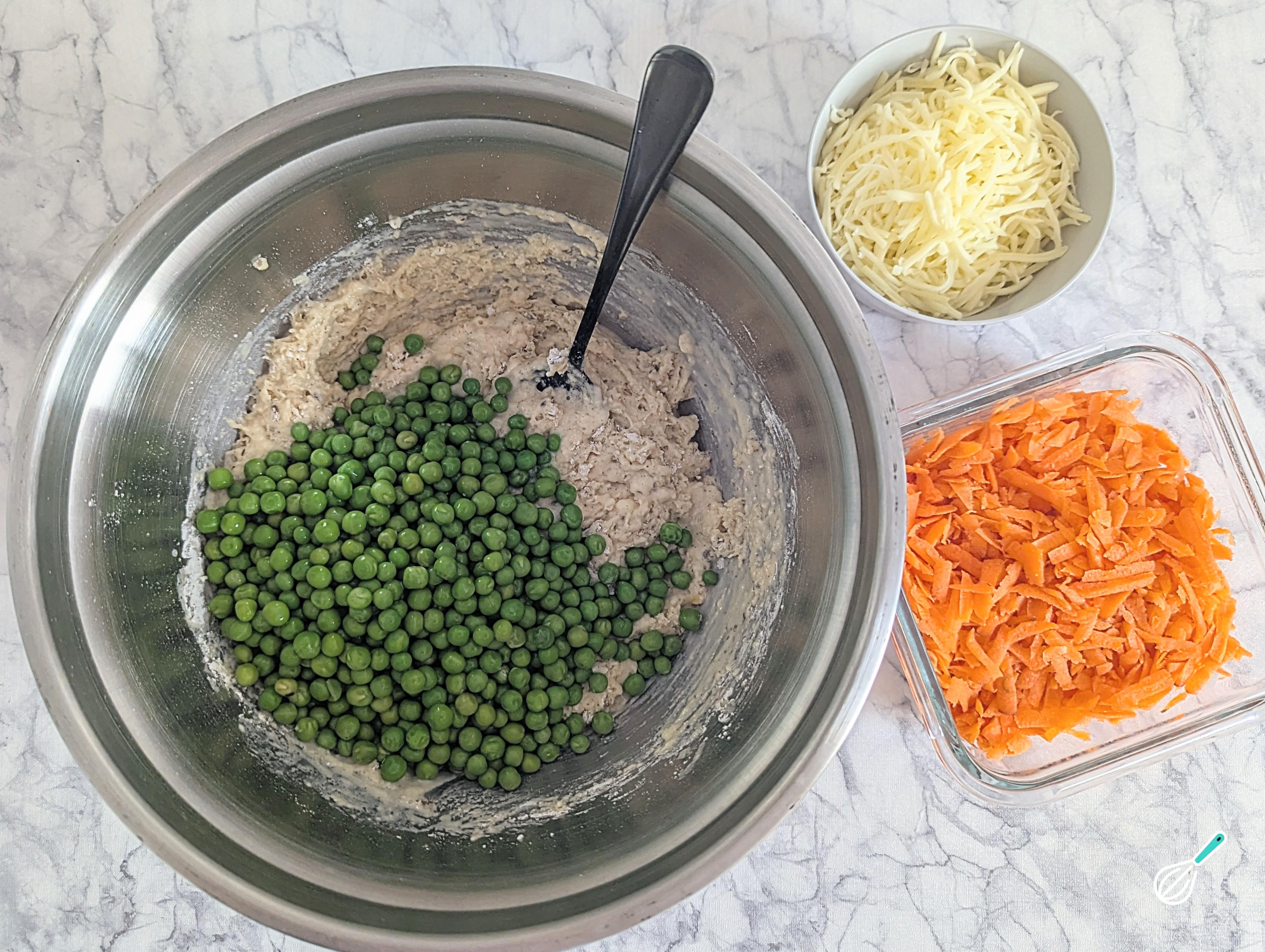 Primeiramente separe todos os ingredientes para esta receita de torta de ervilha. Se estiver utilizando ervilha congelada, cozinhe rapidamente em água fervente por 2 minutos e escorra. Rale as cenouras no ralo grosso e pique a cebolinha. Pré-aqueça o forno a 180°C e unte uma forma retangular com óleo e farinha de trigo.
