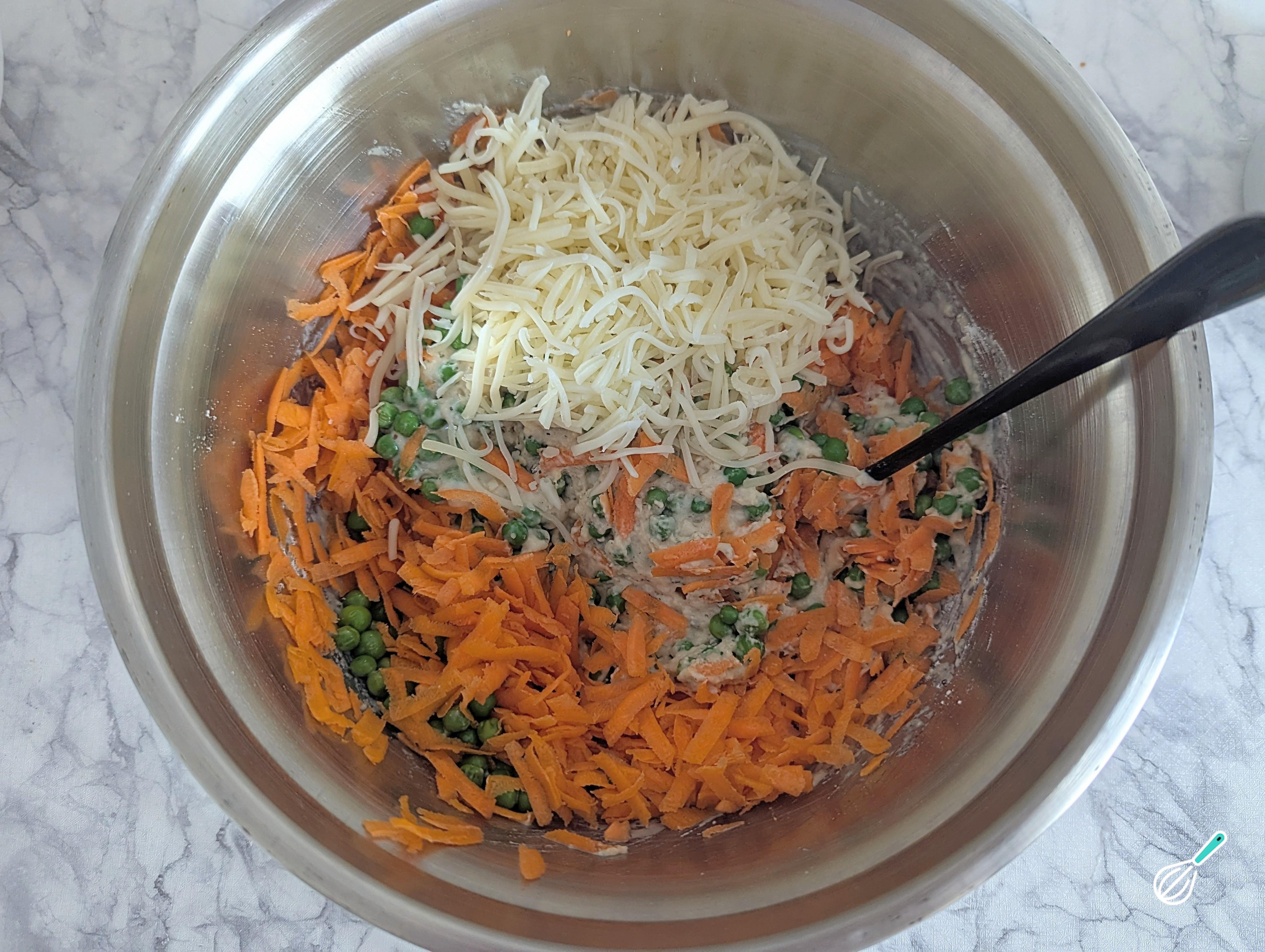 Adicione agora a cenoura e o queijo ralado, misturando cuidadosamente para distribuir os ingredientes de forma uniforme.