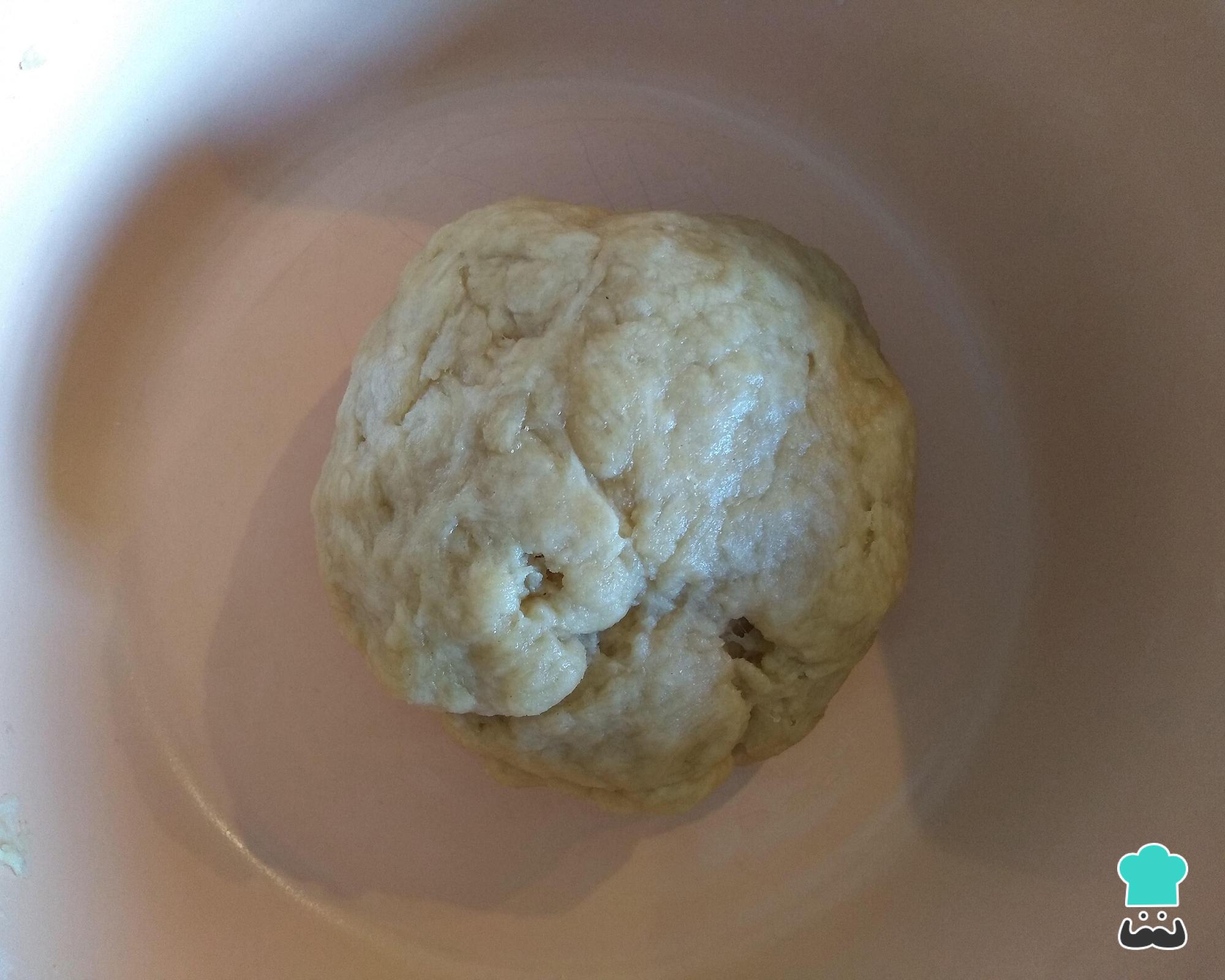 Pouco a pouco adicione a água e misture até obter uma massa espessa. Termine de amassar com as mãos até ficar consistente o suficiente para modelar em forma de bola. Nesse momento reserve esta massa para torta salgada na geladeira.