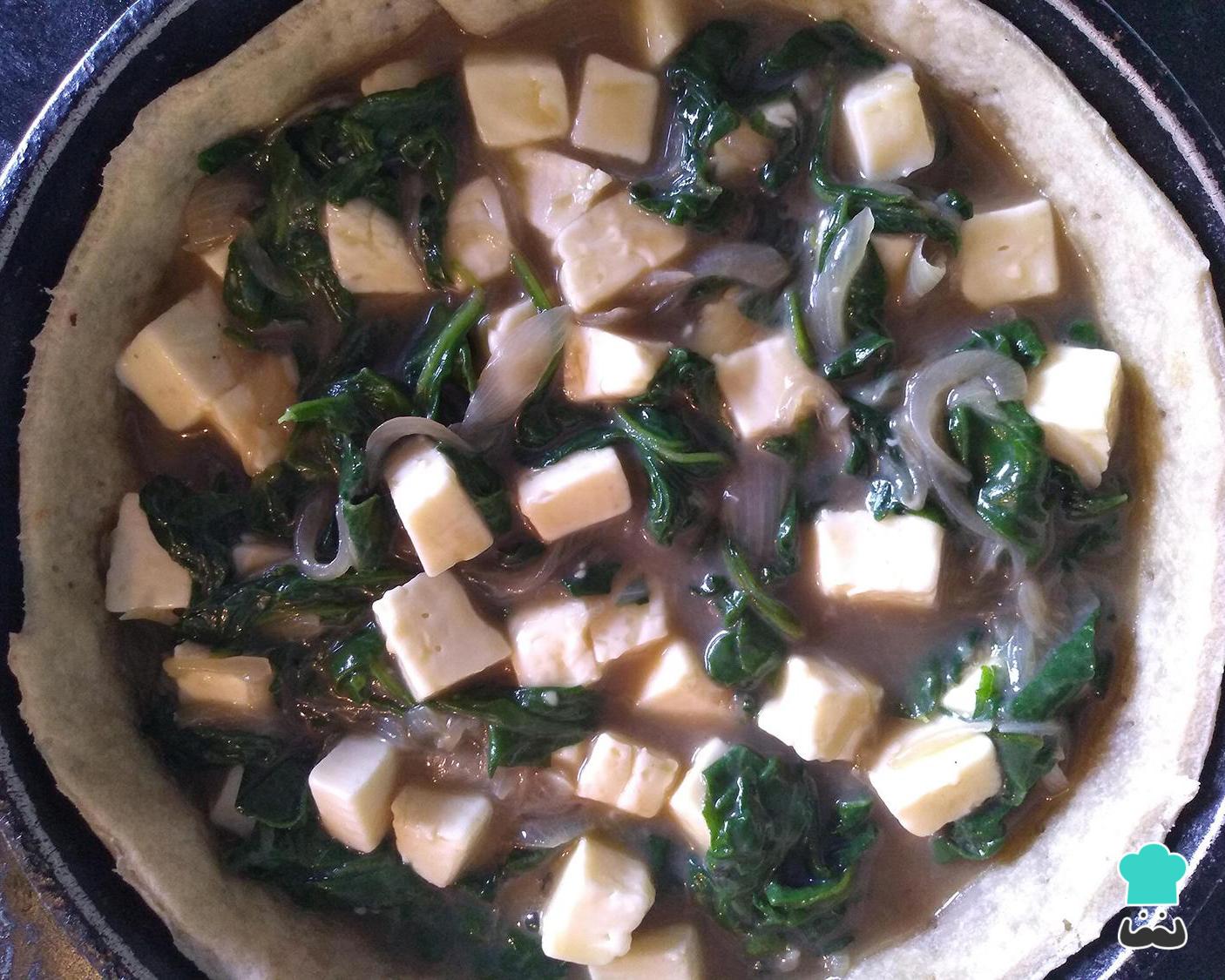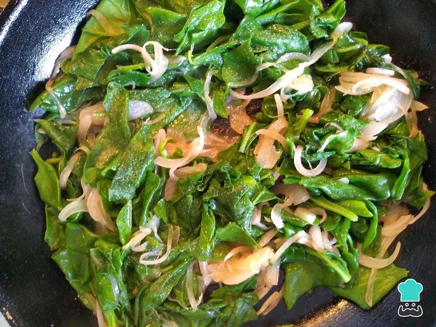 Adicione o espinafre lavado e seco na cebola e misture. Deixe o espinafre cozinhar até reduzir, isso é importante para evaporar a água nele e conseguir uma torta salgada consistente e mais saborosa.