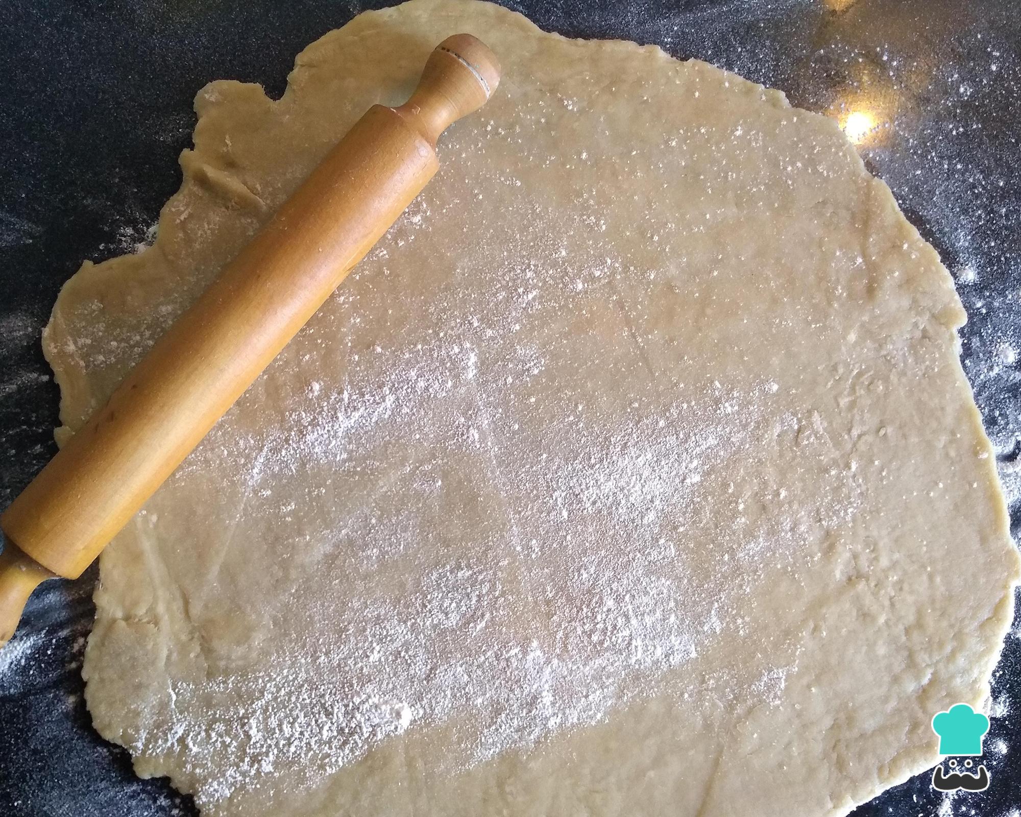 Enquanto isso pegue a massa novamente e, numa bancada enfarinhada, abra-a com a ajuda do rolo da massa. O ideal é abrir a massa em formato redondo até ficar com cerca de 3 mm de espessura.