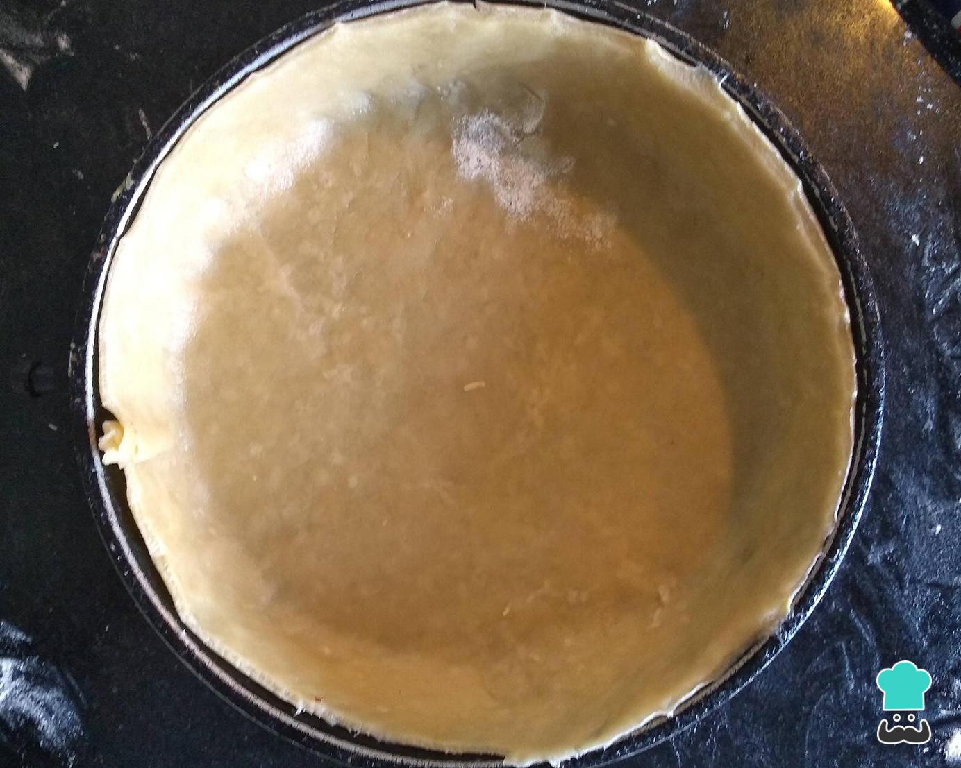 Ajeite a massa dentro de uma forma de fundo amovível untada e corte o excesso das beiradas. Pique o fundo com um garfo, para evitar que forme bolhas de ar, e coloque assando no forno preaquecido a 180ºC durante 5-8 minutos.