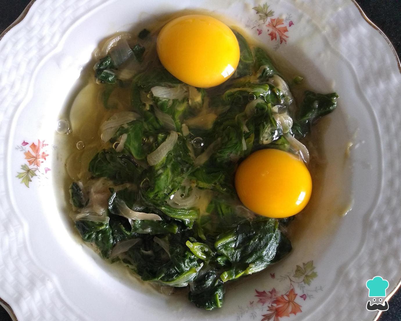 Quando o espinafre refogado estiver morno, adicione-lhe os ovos e mexa bem, para misturar. Acerte o sabor adicionando mais uma pitada de sal, pimenta do reino e noz moscada.