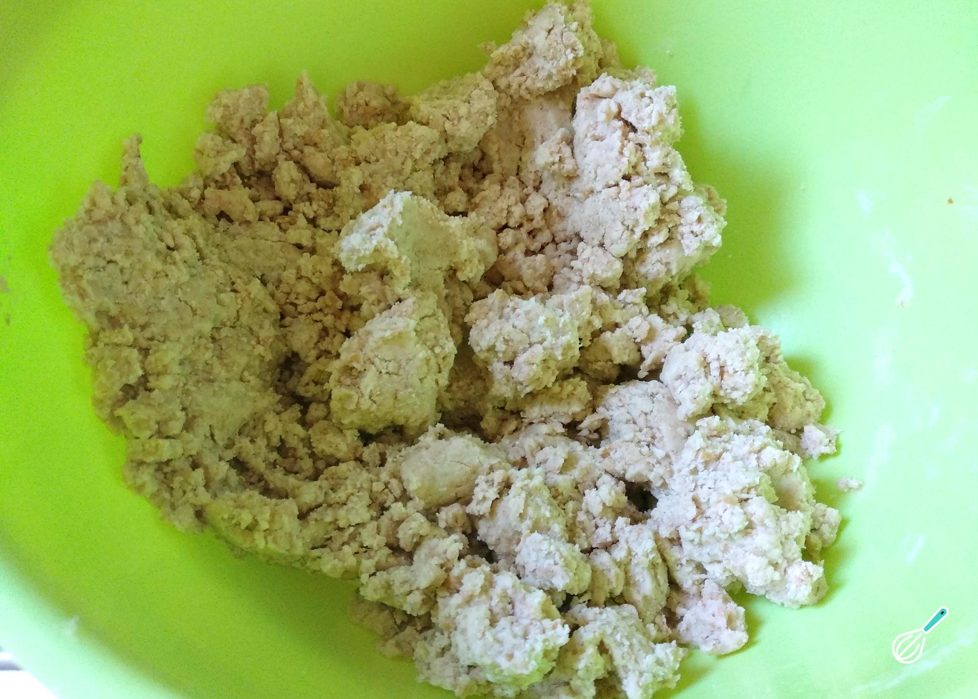 Acrescente a farinha e o sal e misture com as mãos até virar uma massa com consistência semelhante a farofa, mas que fica compacta quando apertamos.