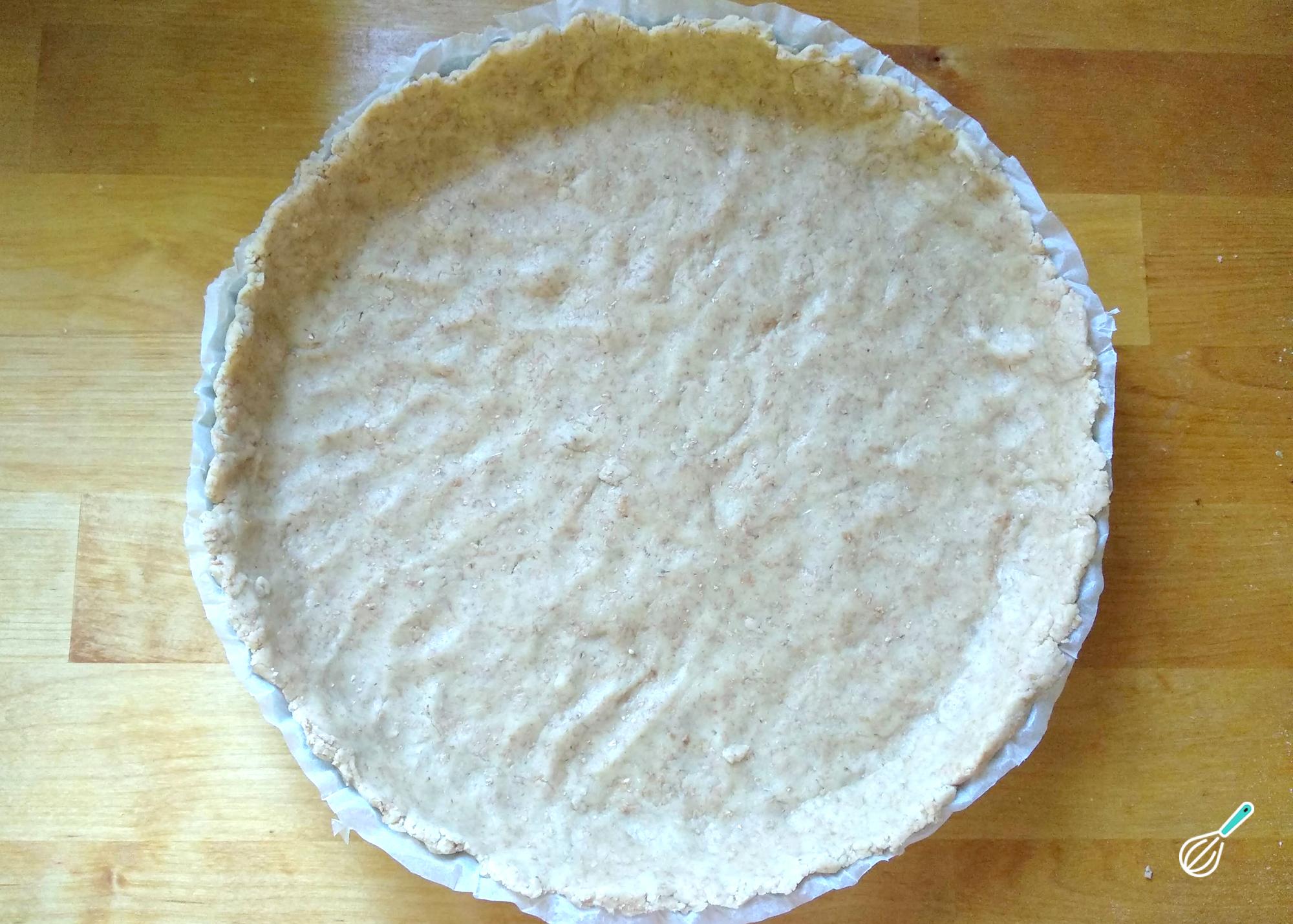 Coloque a massa numa forma de torta de fundo amovível e abra com os dedos até forrar o fundo e as laterais. Reserve na geladeira por 20-30 minutos.