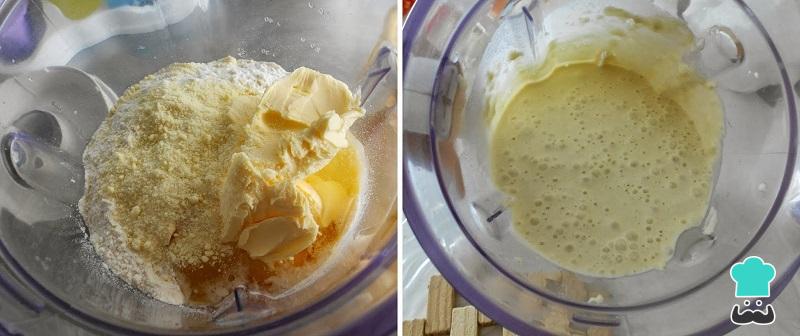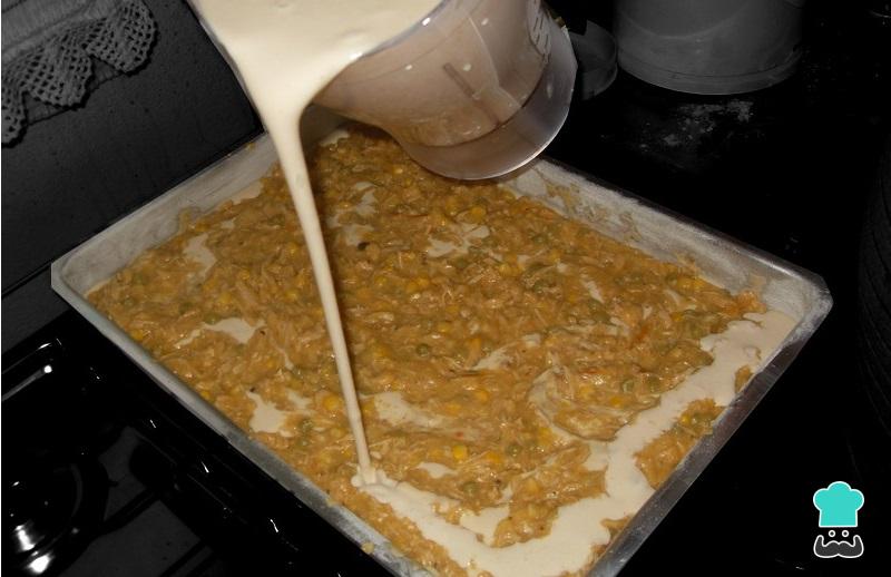 O primeiro passo desta receita é preparar a massa da torta. Para isso simplesmente bata todos os ingredientes no liquidificador até obter uma massa homogênea. Reserve.