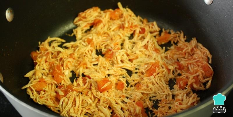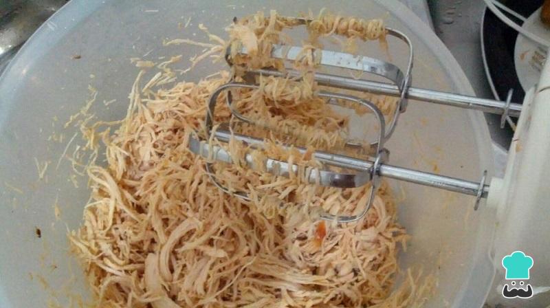 Em seguida prepare o recheio da torta de frango, começando a desfiar o frango, à mão, com a ajuda de garfos ou na batedeira.