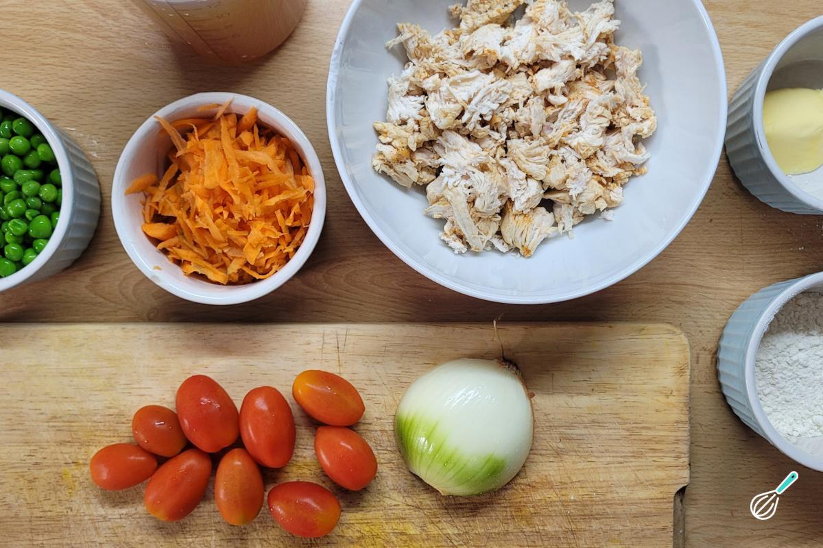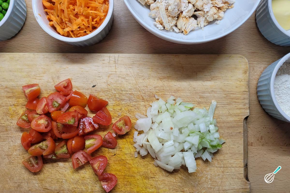Separe os ingredientes para fazer o recheio da sua torta de frango. Para essa receita, vamos começar pelo recheio porque ele precisa esfriar antes de ser colocado na massa.
