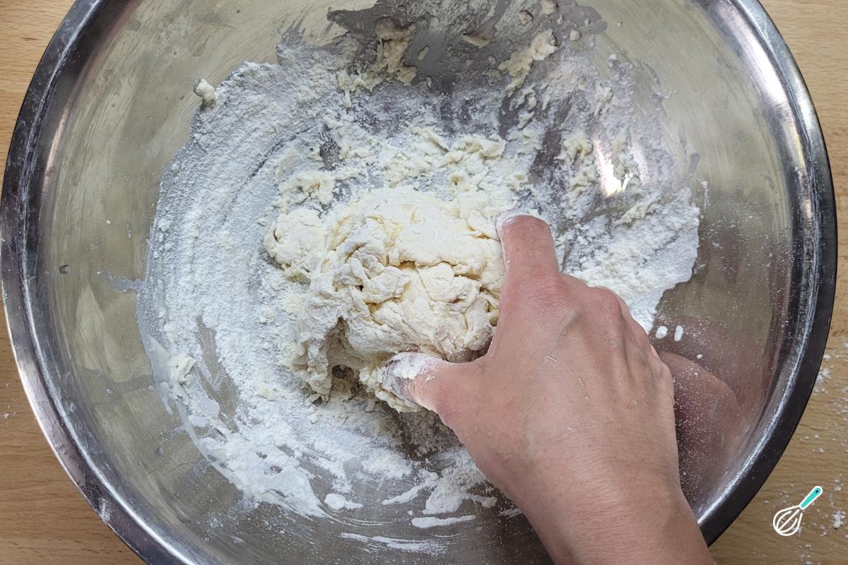 Quando chegar nesse ponto, adicione a água bem aos poucos até ter uma massa que consiga modelar. Não precisa - nem deve! - sovar a massa. A ideia é apenas misturar até que toda a farinha da tigela tenha sido incorporada.