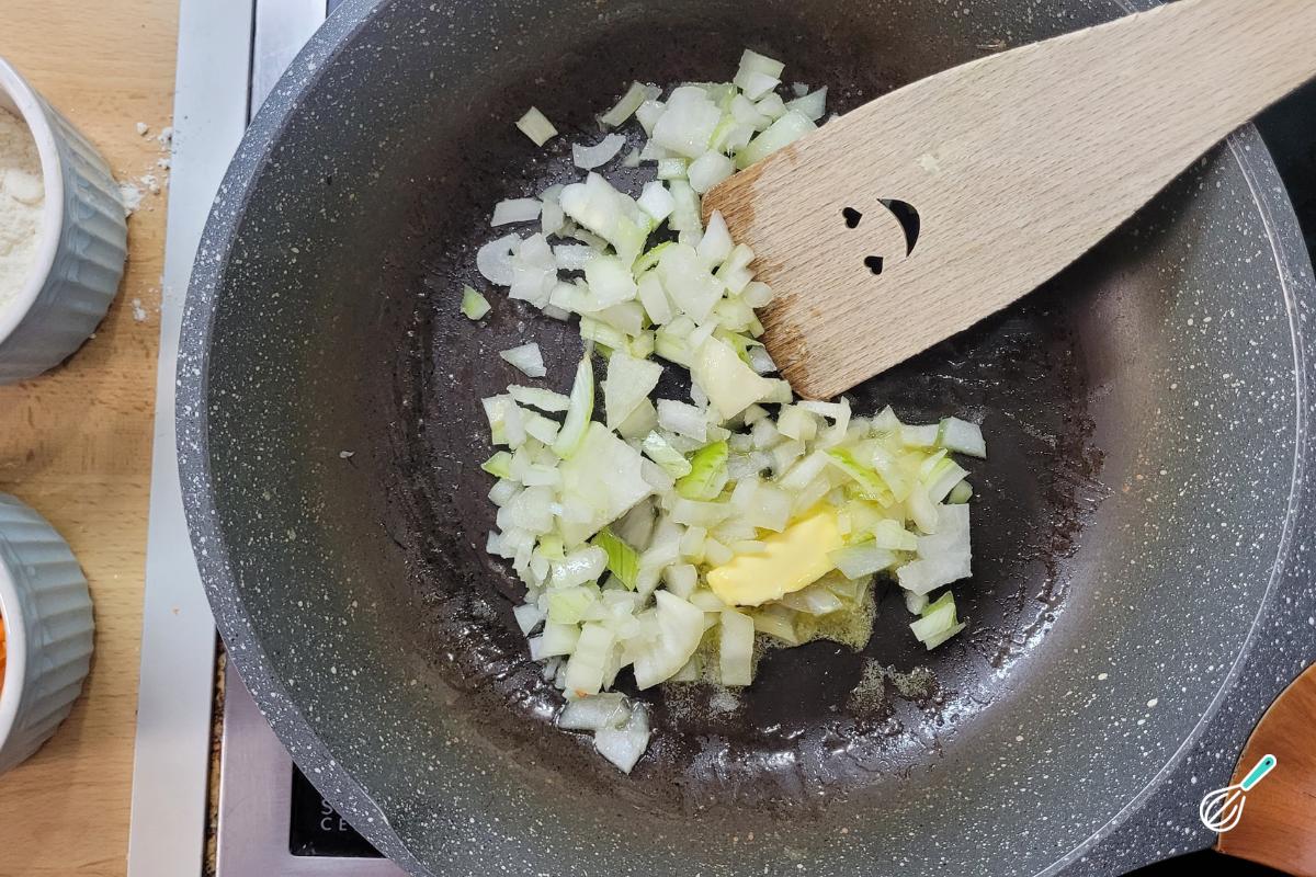 Em uma frigideira, adicione a manteiga e quando derreter, adicione a cebola para refogar. Tempere com sal.