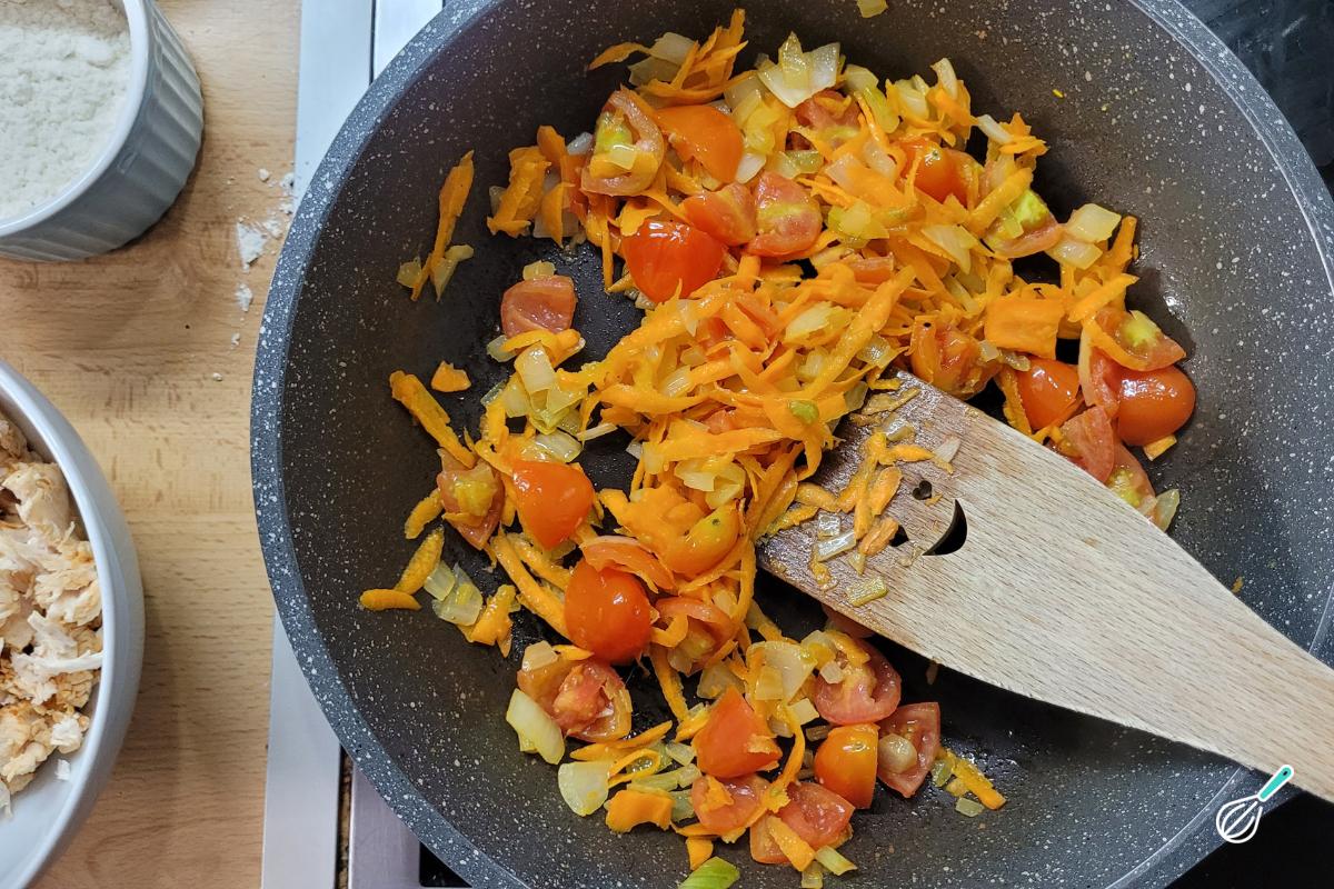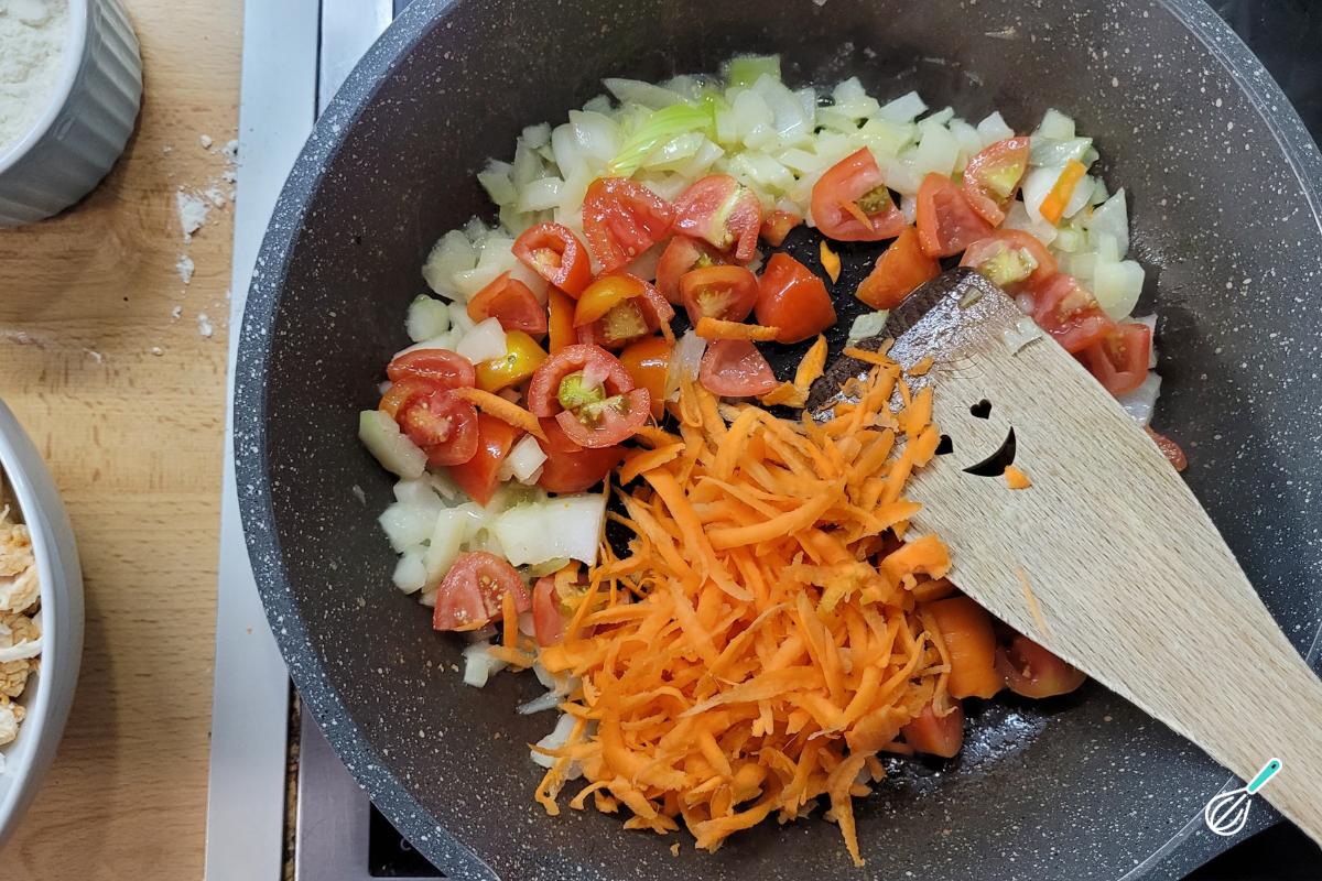 Quando a cebola estiver bem dourada, adicione os tomatinhos e a cenoura.