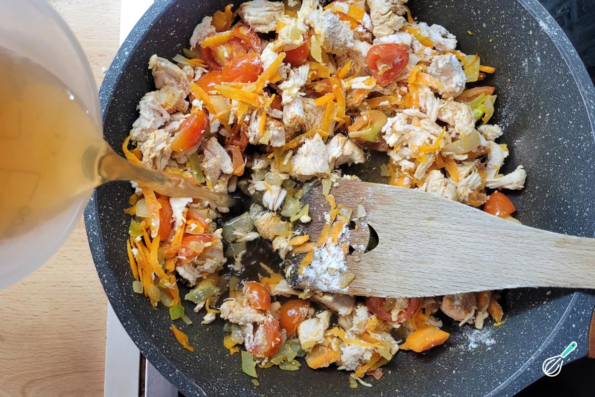 Adicione o caldo de legumes mexendo para evitar que empelote.