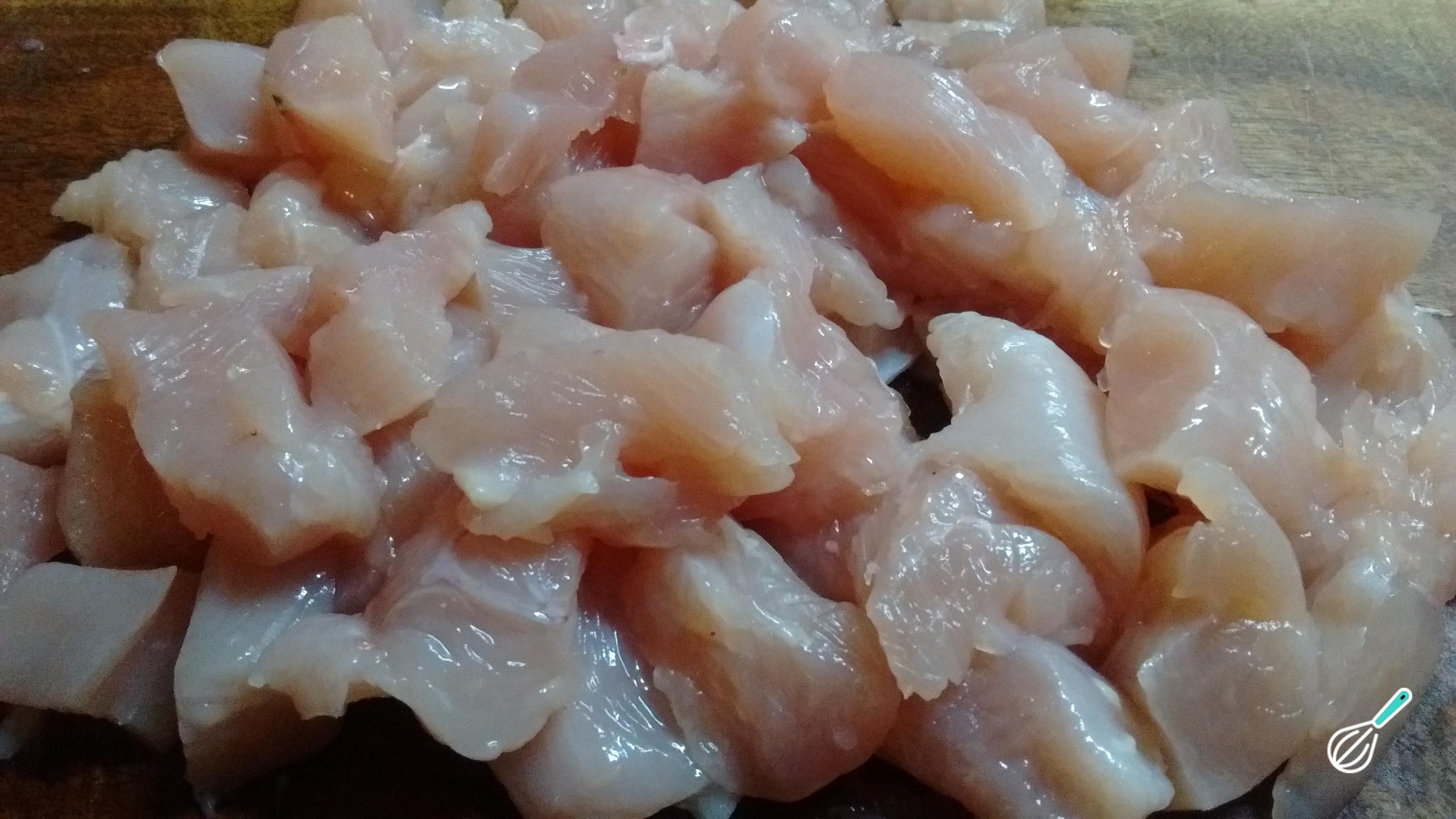 Limpe o peito de frango removendo o excesso de gordura ou pele que possa ter. Em seguida, corte em cubos não muito grandes .