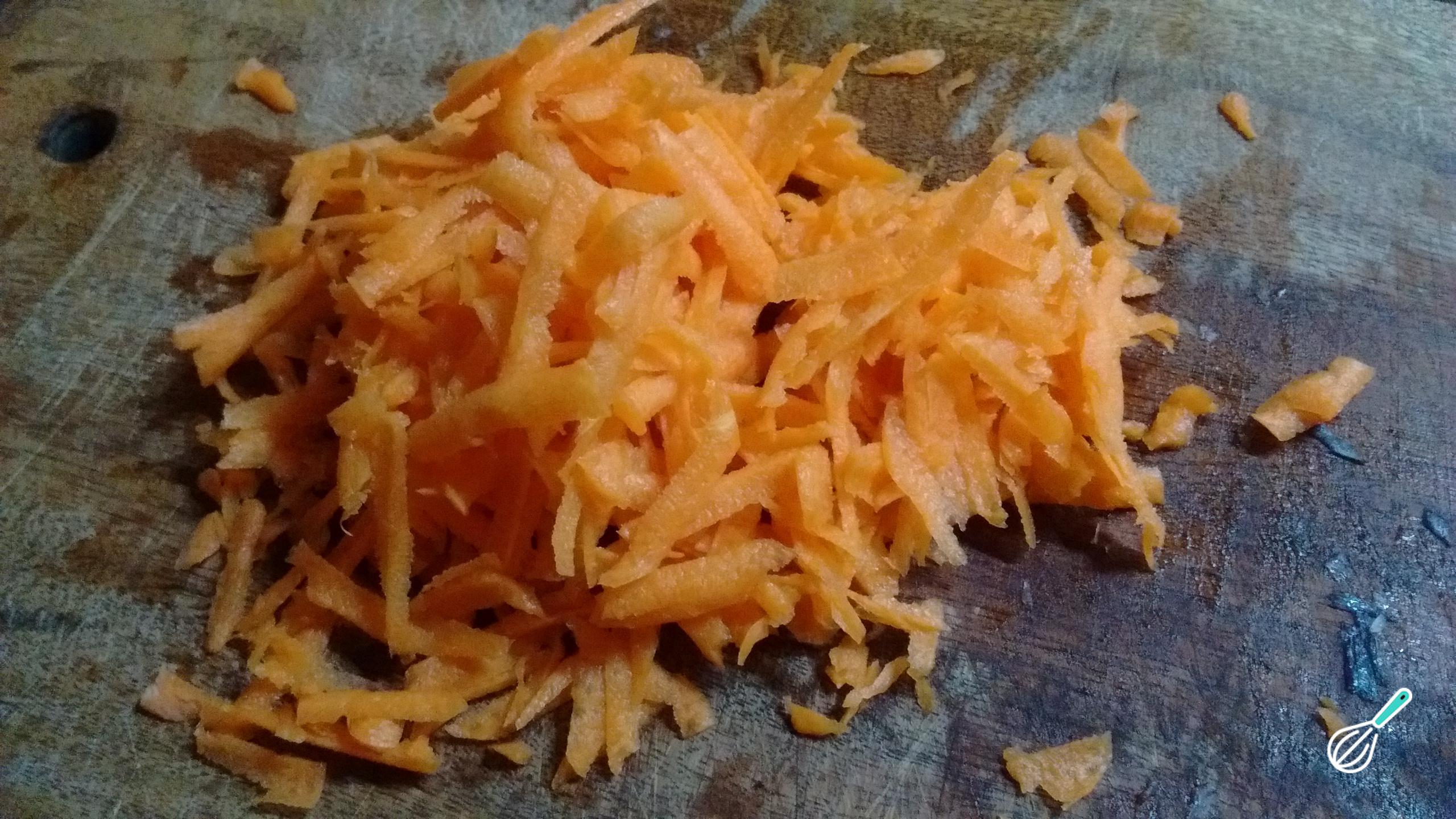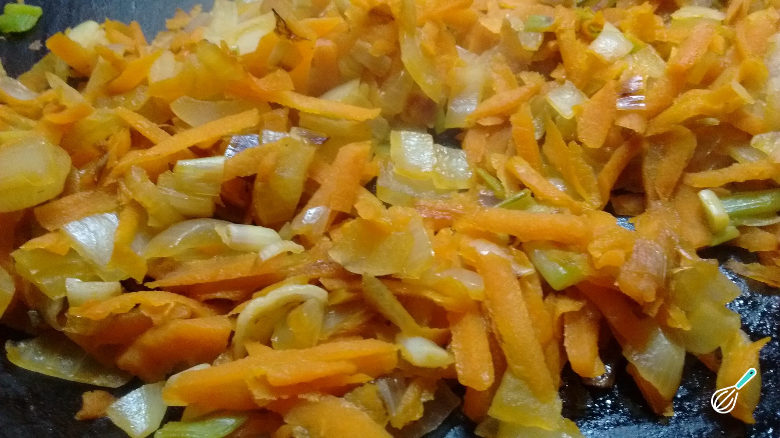 Aqueça uma colher de sopa de azeite em uma panela e frite a cebola e a cenoura. Retire também os legumes da panela e reserve.