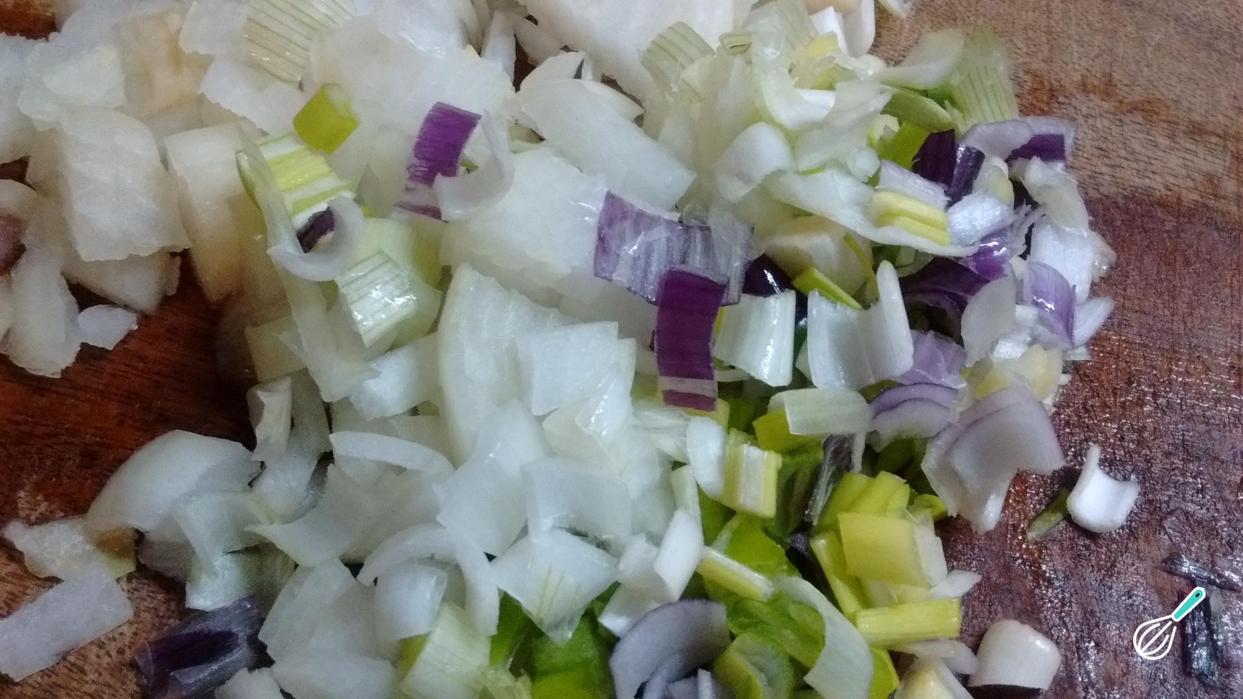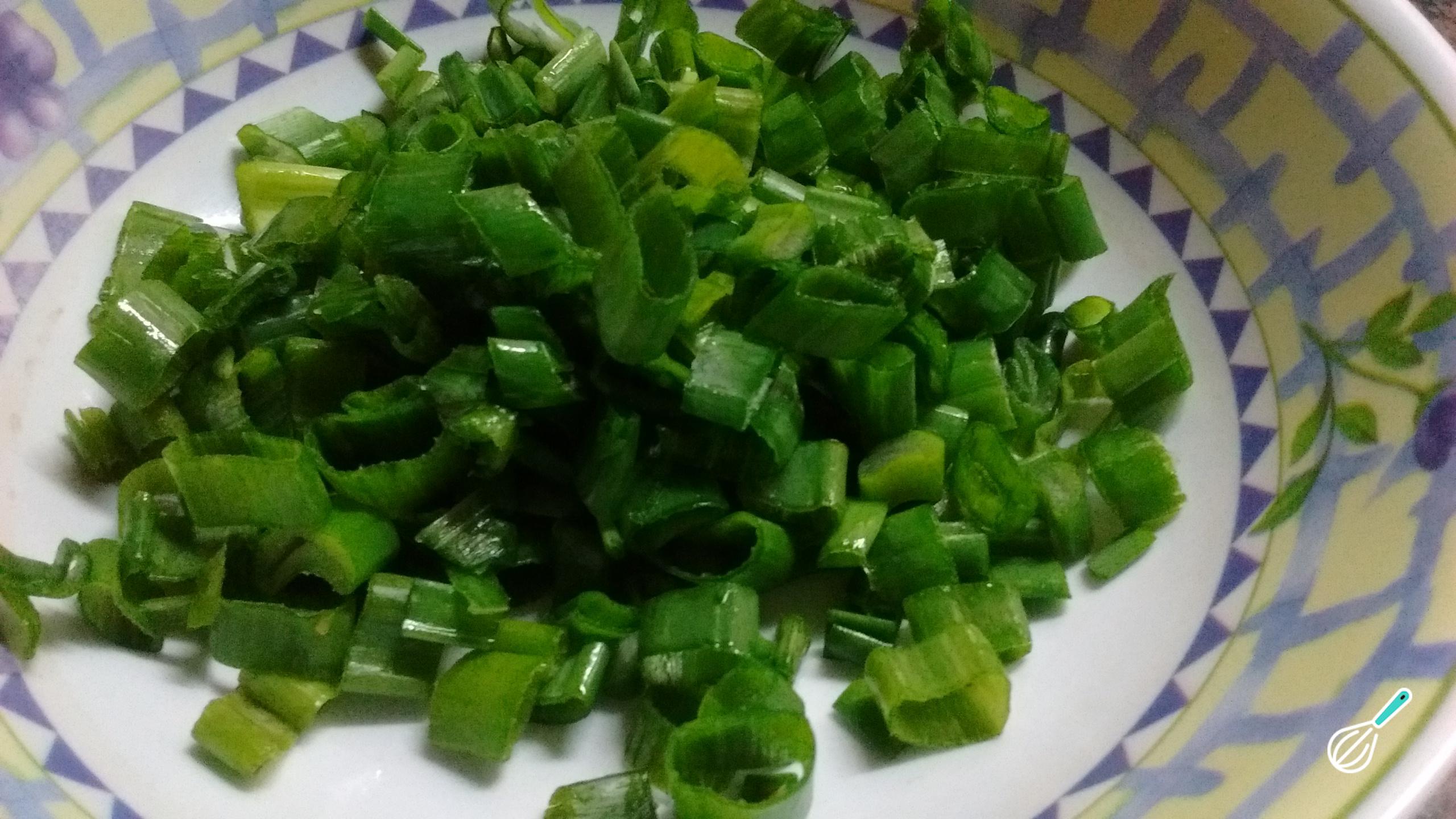 Posteriormente, descasque e pique a cebola. Além disso, lave a cebolinha e pique bem.